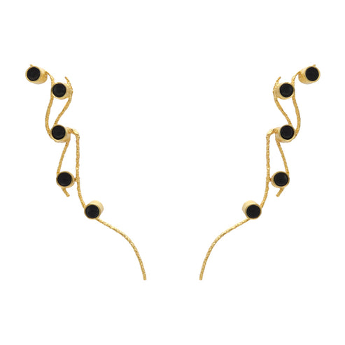 El cuerpo entallado se adapta a tu figura y sienta como un guante. Para los complementos, los elegidos han sido los pendientes Karma , con piedra natural de color negro.