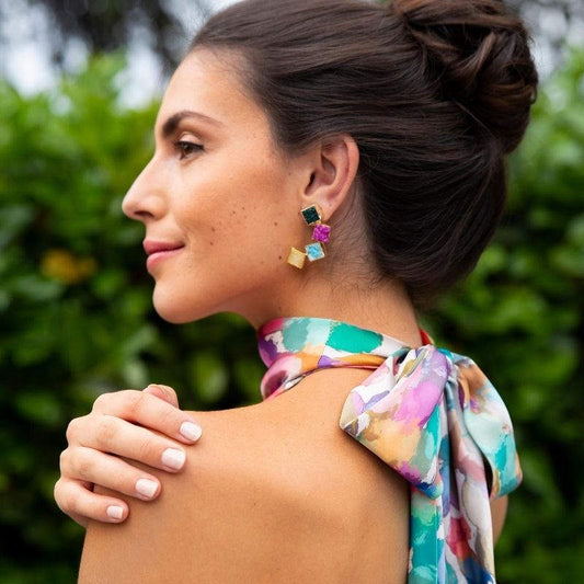 Pendientes Mademoiselle Plata Azul turquesa, Fucsia y Amarillo