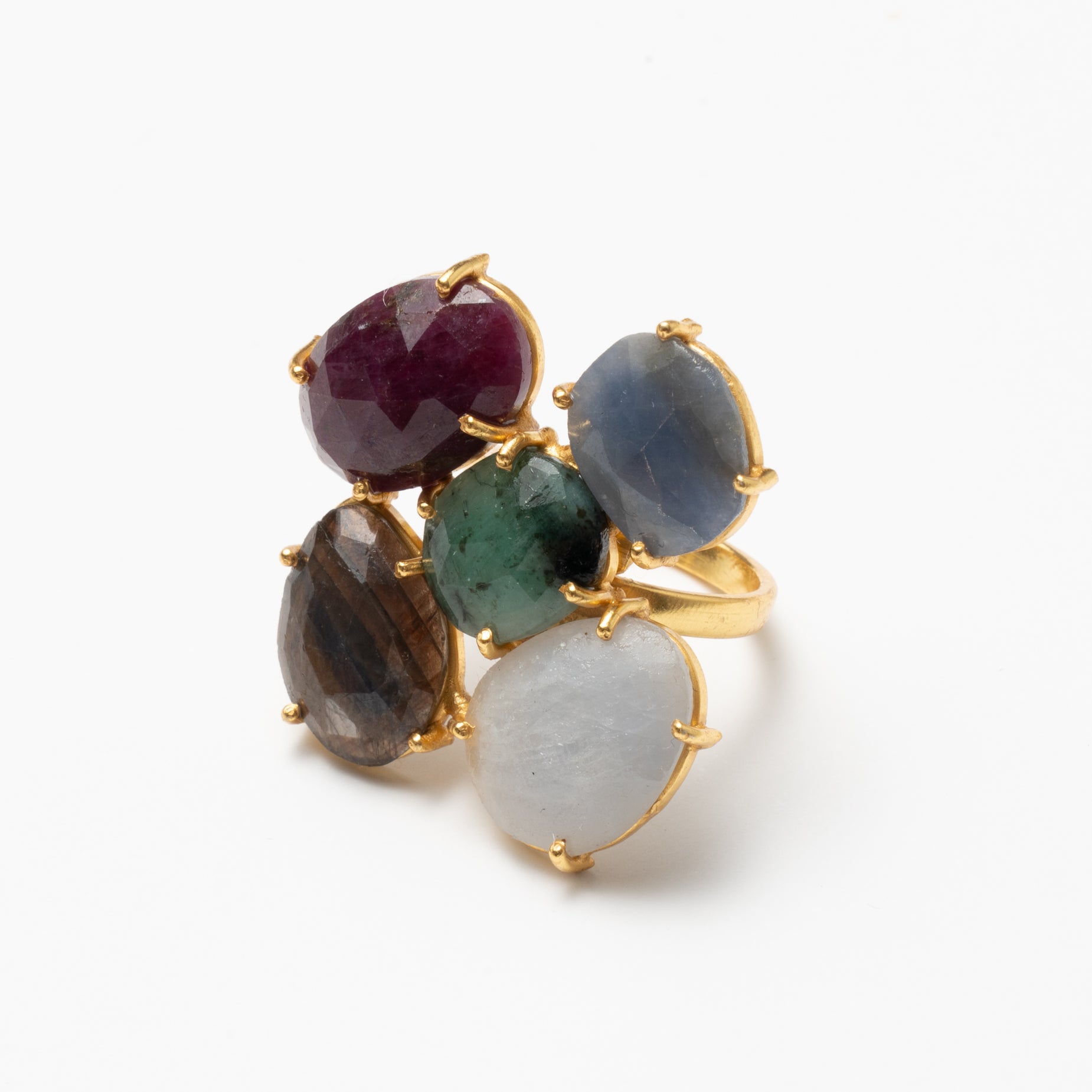 Su diseño innovador presenta 5 piedras impresionantes, cada una tallada para realzar su brillo único y resplandeciente. El engaste meticulosamente trabajado sostiene las piedras firmemente, convirtiendo este anillo en una declaración audaz que captura la luz desde todos los ángulos.