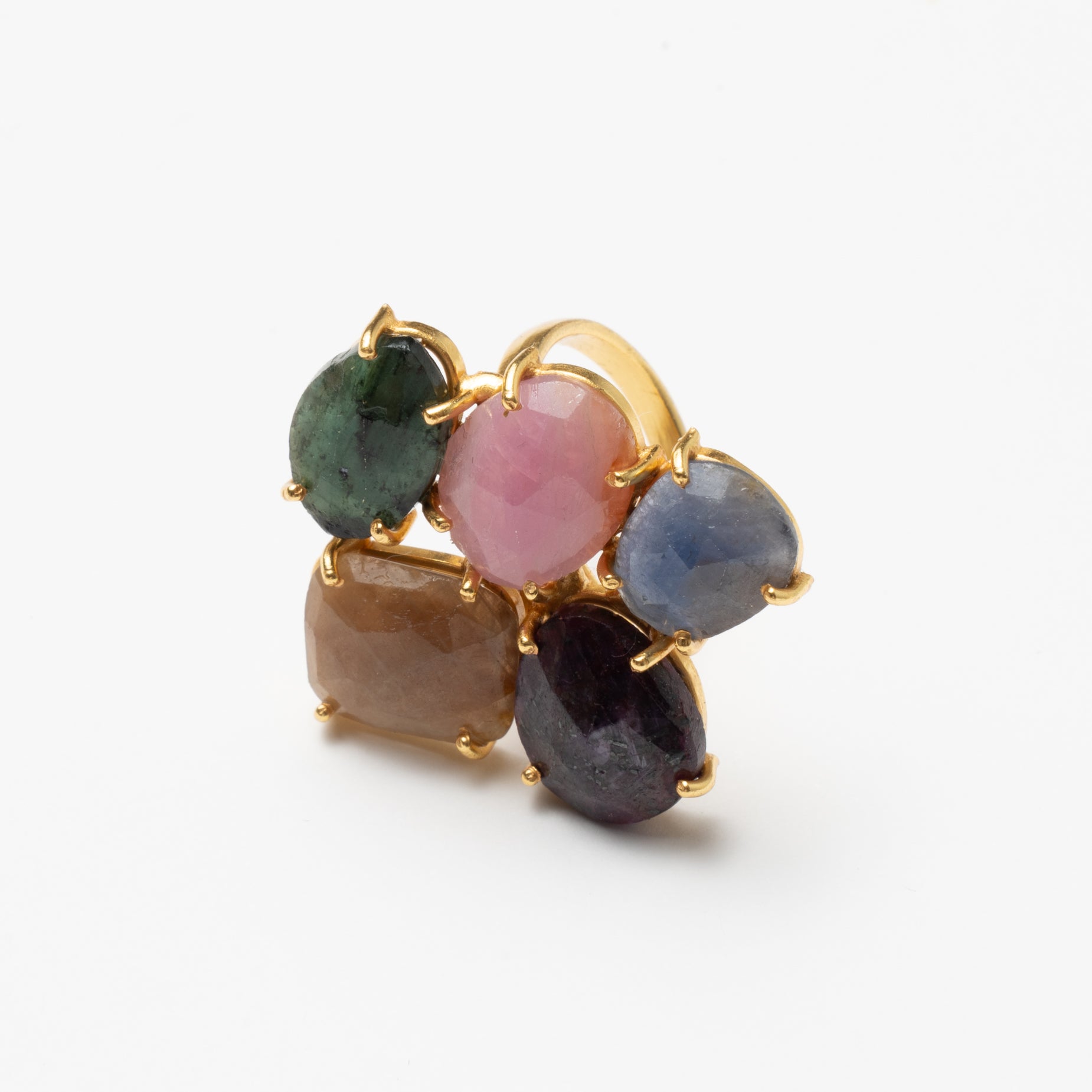 Su diseño innovador presenta 5 piedras impresionantes, cada una tallada para realzar su brillo único y resplandeciente. El engaste meticulosamente trabajado sostiene las piedras firmemente, convirtiendo este anillo en una declaración audaz que captura la luz desde todos los ángulos.