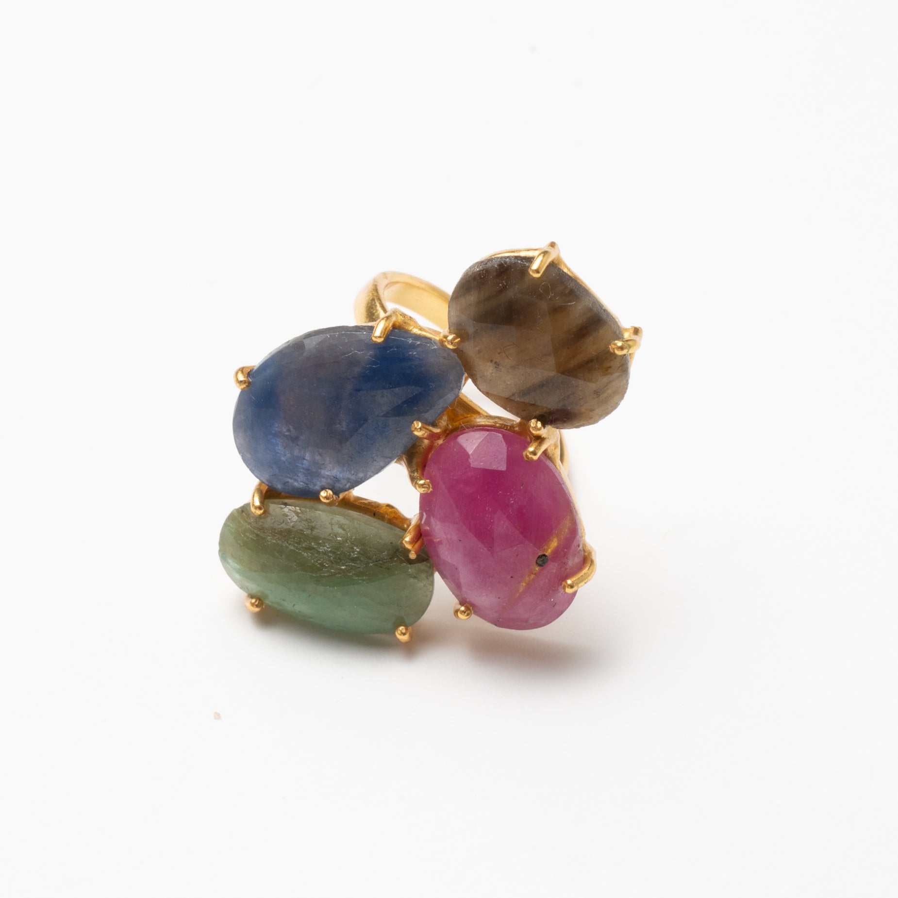 Un anillo XL formado por 4 piedras naturales de diferentes tamaños y colores. Este modelo pertenece a la colección Capsula Mosaico exclusiva de piedras premium.