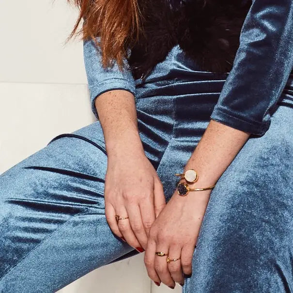 Brazalete de dos piedras ajustable para poder ponértelo tanto en la parte de abajo de la muñeca, superponiendo las piedras, o en el antebrazo con las piedras mas separadas.
