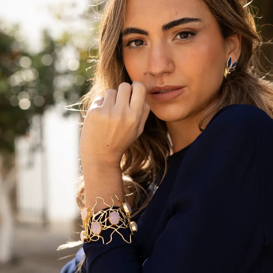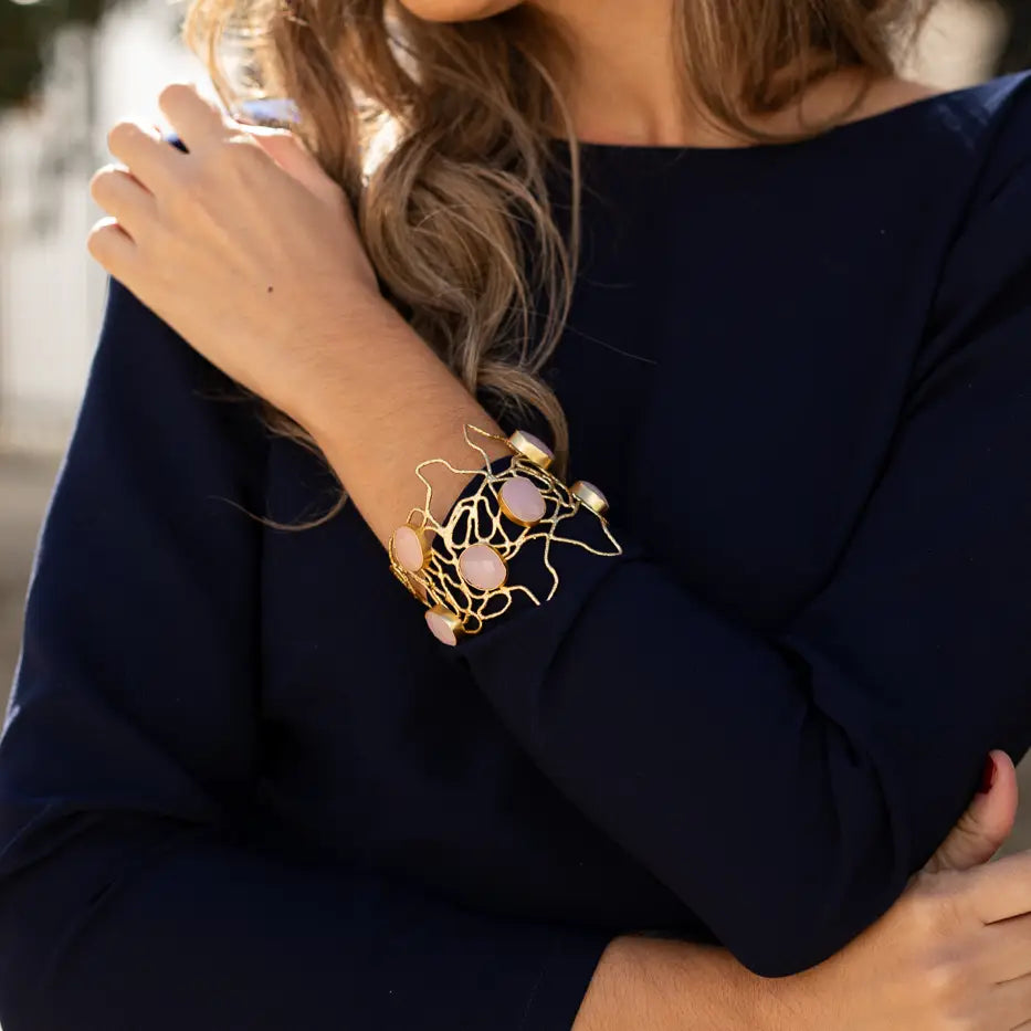Brazalete formado por diferentes líneas que se entrecruzan y sostienen varias piedras. Un diseño único y muy vistoso que aporta originalidad y combina fácilmente con distintos looks.