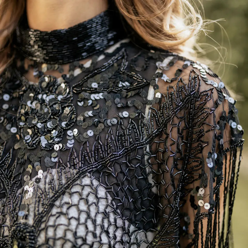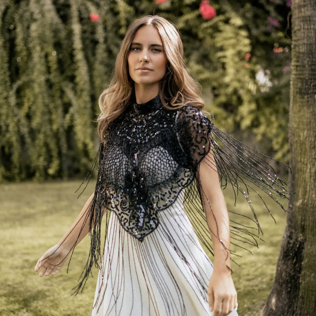 La capa joya Aura es el complemento que transforma cualquier look en un verdadero espectáculo. Cada centímetro está adornado con cuentas que reflejan la luz y crean un efecto deslumbrante en movimiento. Su diseño combina líneas fluidas con formas geométricas y motivos delicadamente entrelazados, dando sensación de dinamismo y sofisticación. La silueta fluida y su caída elegante envuelven el cuerpo con gracia, realzando cualquier conjunto. Perfecta para eventos especiales o para añadir un toque de magia a tu día a día, Aura eleva vestidos, trajes o looks casuales, convirtiéndote en el centro de todas las miradas.
