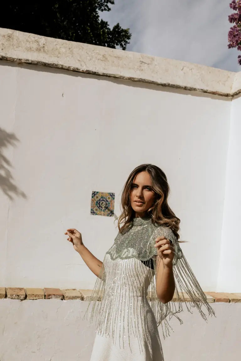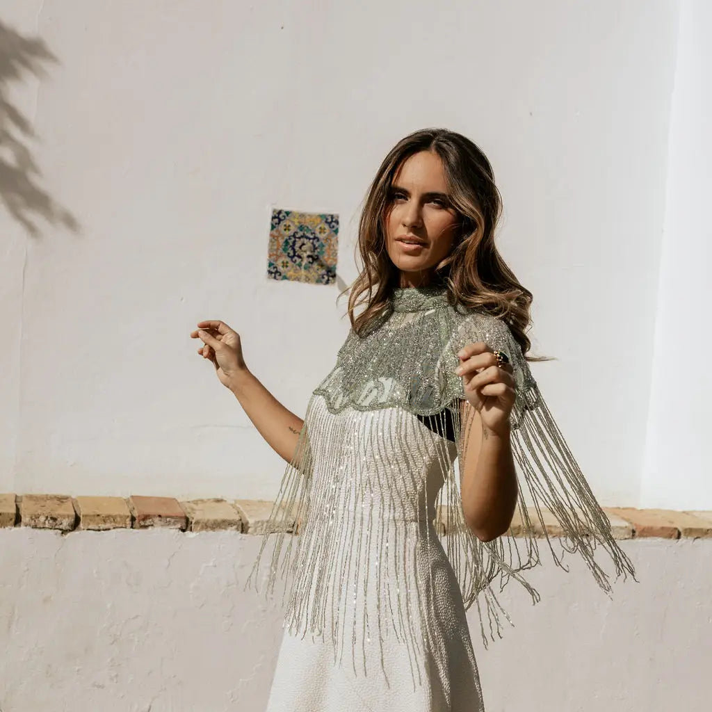 El brillo de sus cuentas y lentejuelas está estratégicamente distribuido para capturar la luz en cada ángulo, creando un efecto deslumbrante que hace que todas las miradas se fijen en ti. Cada detalle refleja cuidado y refinamiento, convirtiéndola en una pieza única y memorable.