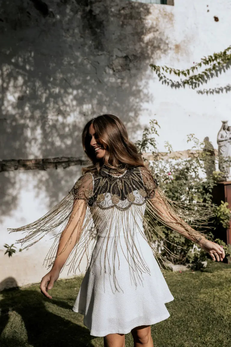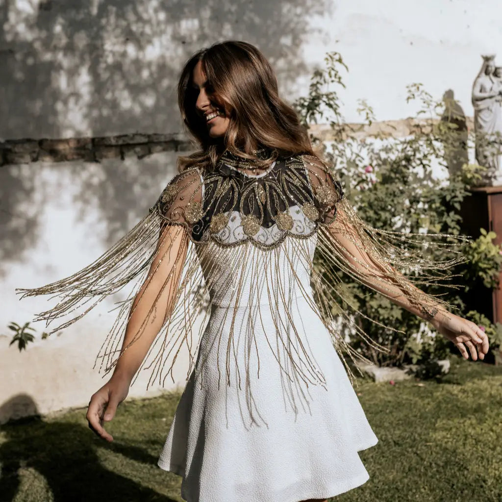 Las lentejuelas y cuentas están dispuestas formando motivos inspirados en hojas y flores, capturando la luz en movimiento y aportando un aire fresco y orgánico. Este detalle convierte la capa en una pieza única, que combina elegancia con un toque natural muy especial.