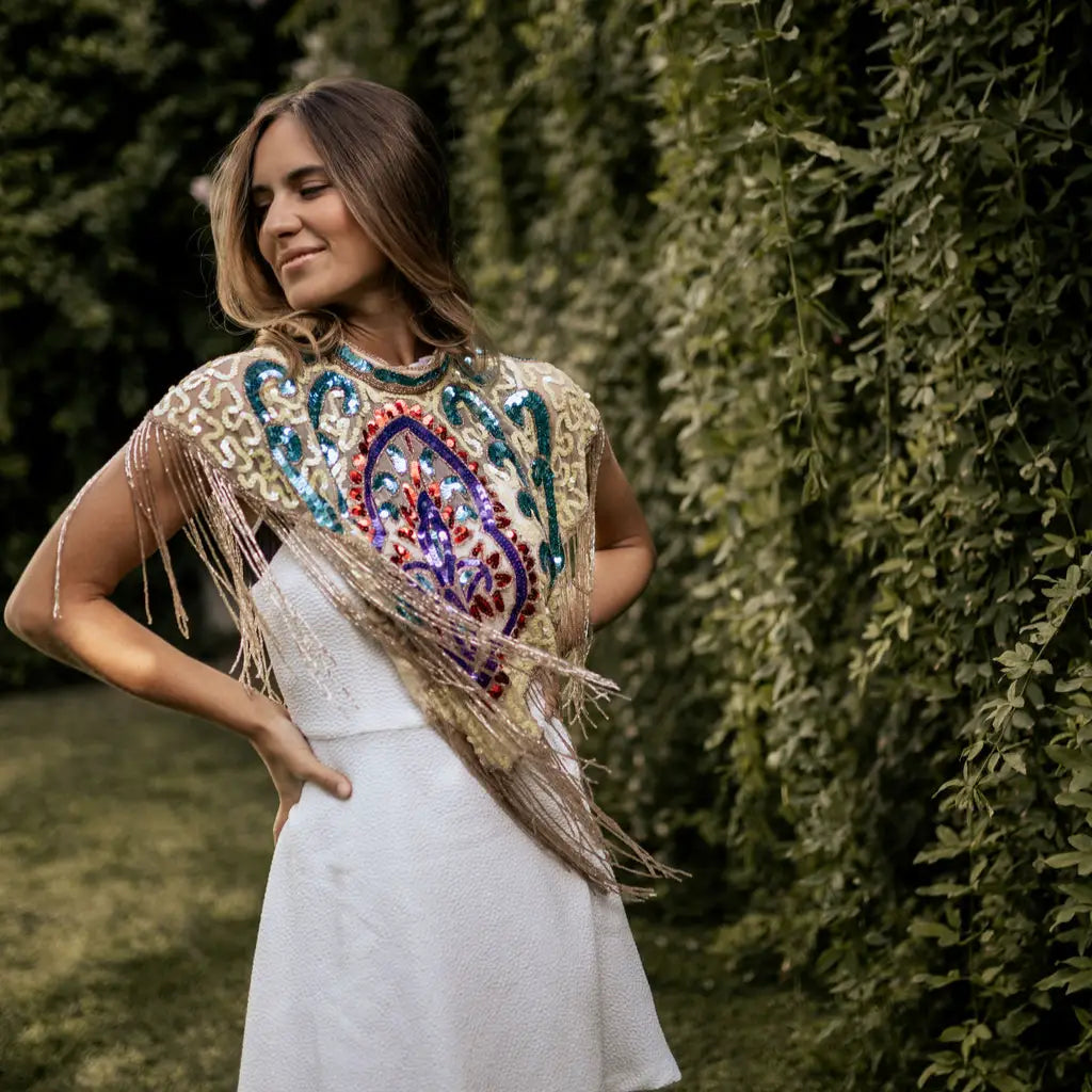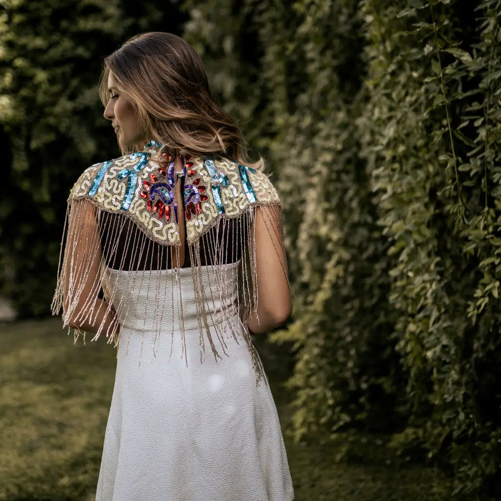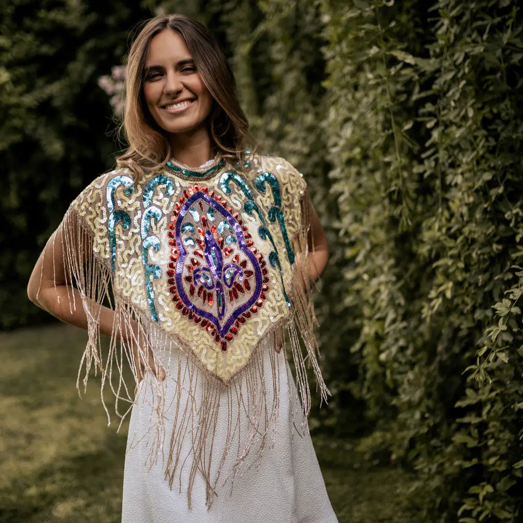 Las lentejuelas y cuentas están dispuestas en líneas curvadas que crean un efecto dinámico y elegante. En la parte posterior, un arabesco se convierte en el protagonista, añadiendo un detalle distintivo y lleno de carácter. Este diseño convierte la capa en una pieza única que atrae todas las miradas.