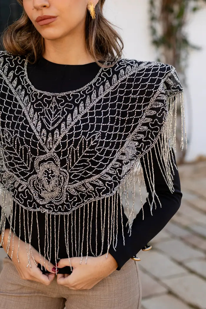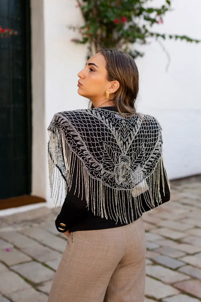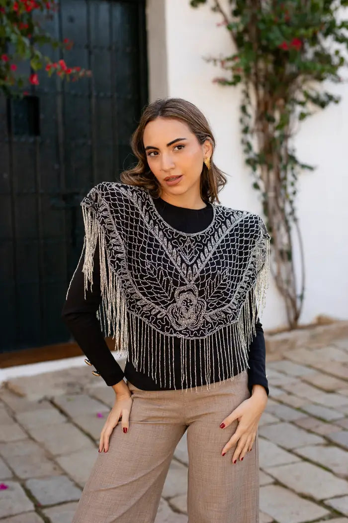 La capa joya Nuit destaca por su diseño elegante y equilibrado. Su caída ligera y silueta fluida envuelven la figura con movimiento y delicadeza, aportando un toque de sofisticación.