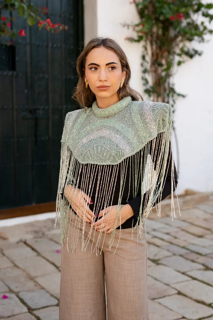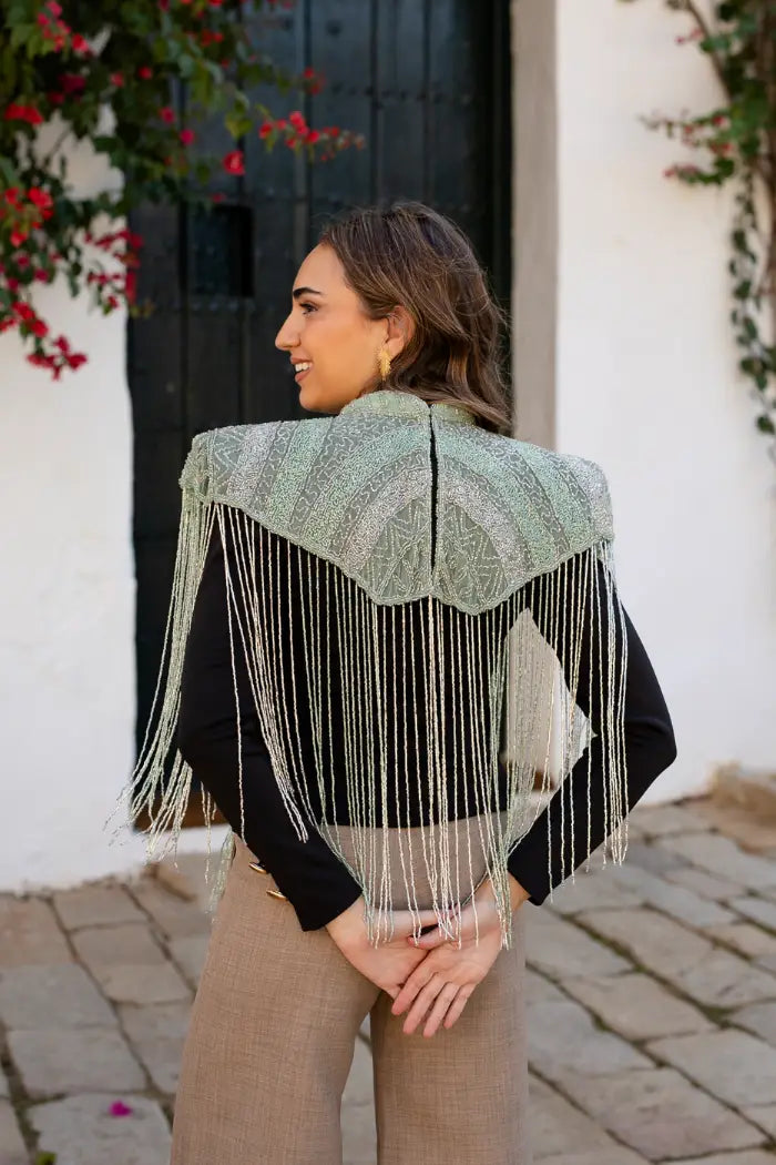 Las cuentas están dispuestas en formas curvadas que recorren toda la capa, creando un efecto dinámico y elegante. Este diseño convierte la capa en una pieza única que atrae todas las miradas.