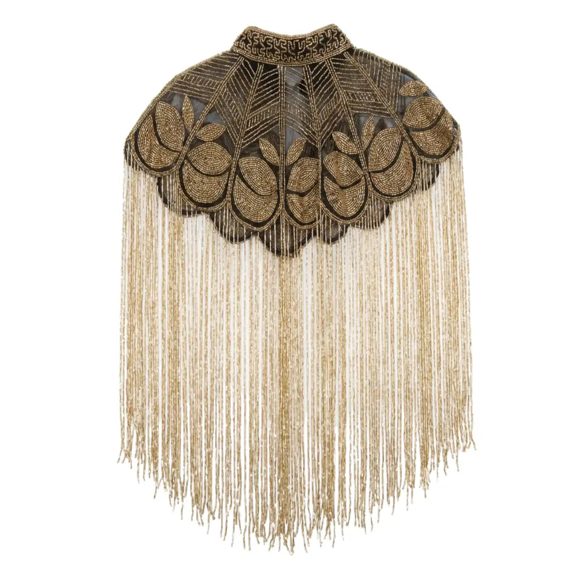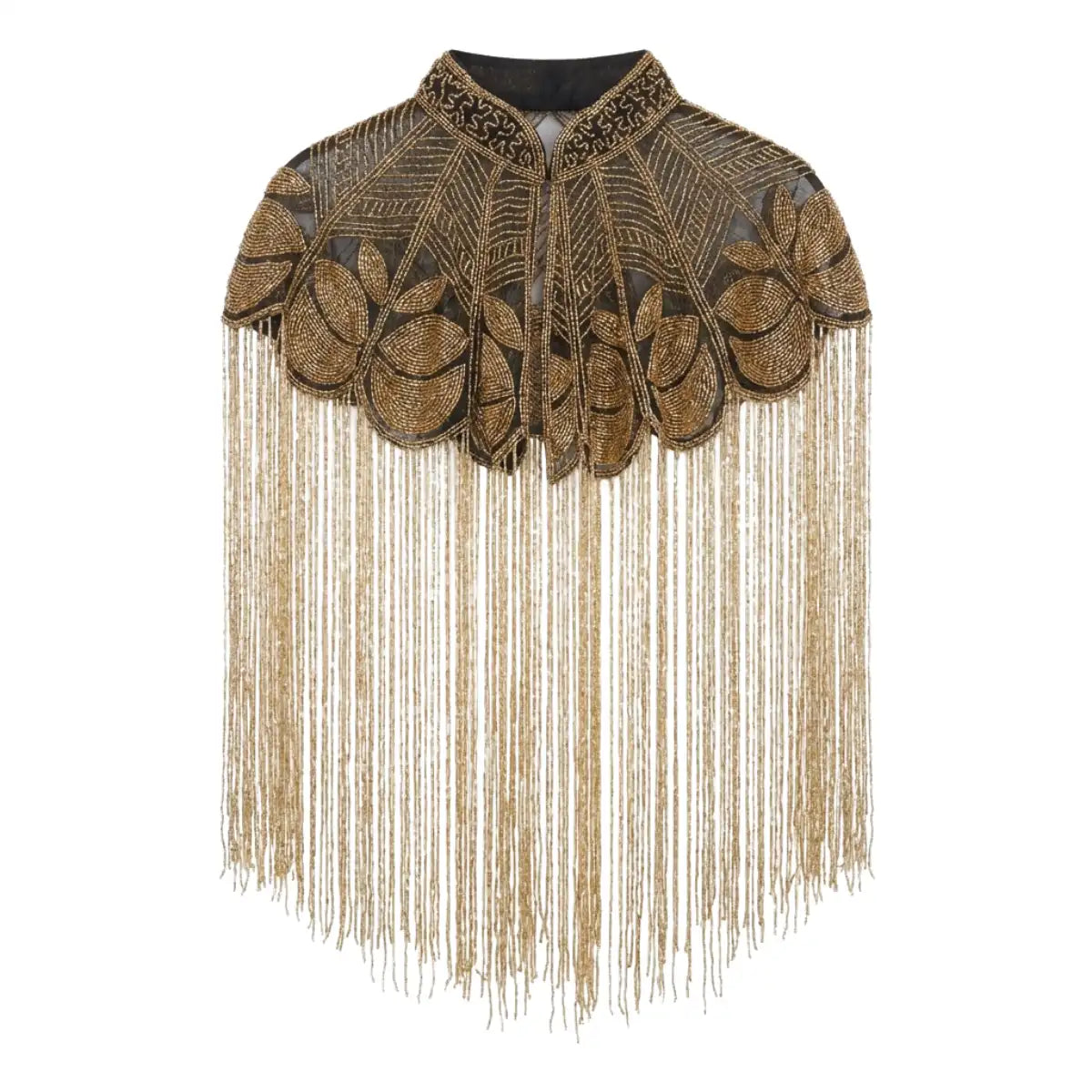 Descubre esta exclusiva capa joya, una pieza artesanal confeccionada en la India con un meticuloso trabajo de cuentas doradas que se entrelazan formando un delicado diseño que recuerda hojas estilizadas. Su forma se ajusta al contorno de los hombros y el cuello, brindando una caída de flecos que aportan movimiento y ligereza al andar. Llevarla es sentir un aura de sofisticación y elegancia, perfecta para elevar cualquier look de noche o añadir un toque único a un outfit más casual.