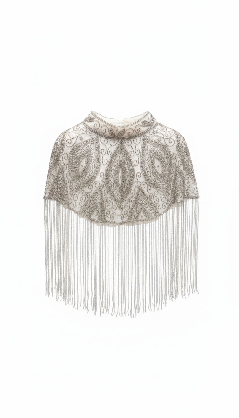 Descubre esta magnífica capa joya, elaborada de forma artesanal en India. Su diseño delicado y curvilíneo recuerda a un abanico de encaje con destellos interminables que capturan la luz en cada movimiento, mientras las finas cadenas colgantes aportan un toque de dinamismo y sofisticación que realza cualquier look. Al ponértela, sentirás una mezcla de elegancia y ligereza, como si te envolviera en un halo de glamour sutil.