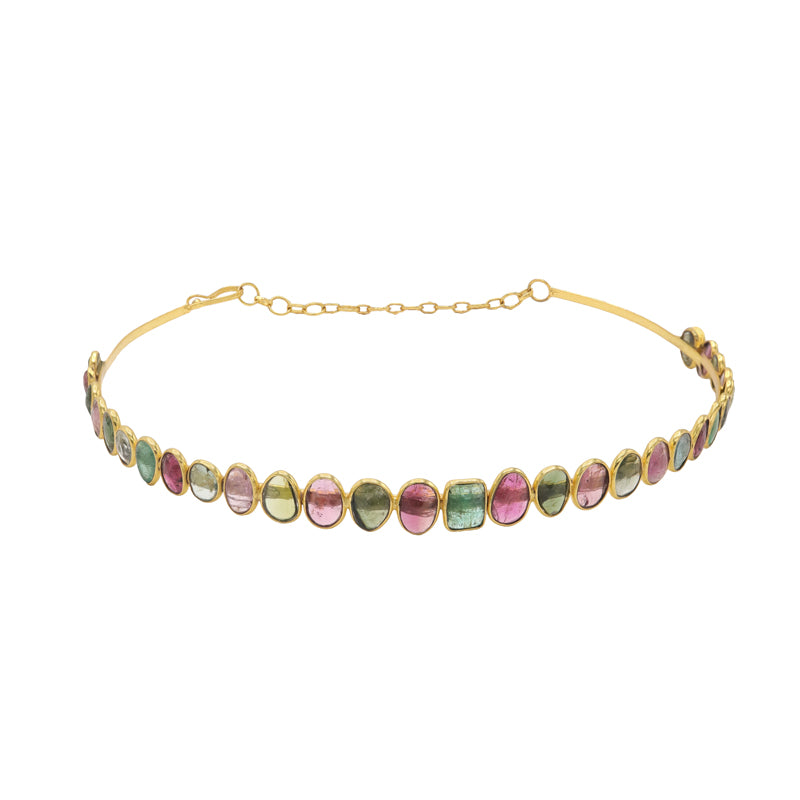 Choker rígido con piedras turmalinas de colores en la parte delantera.