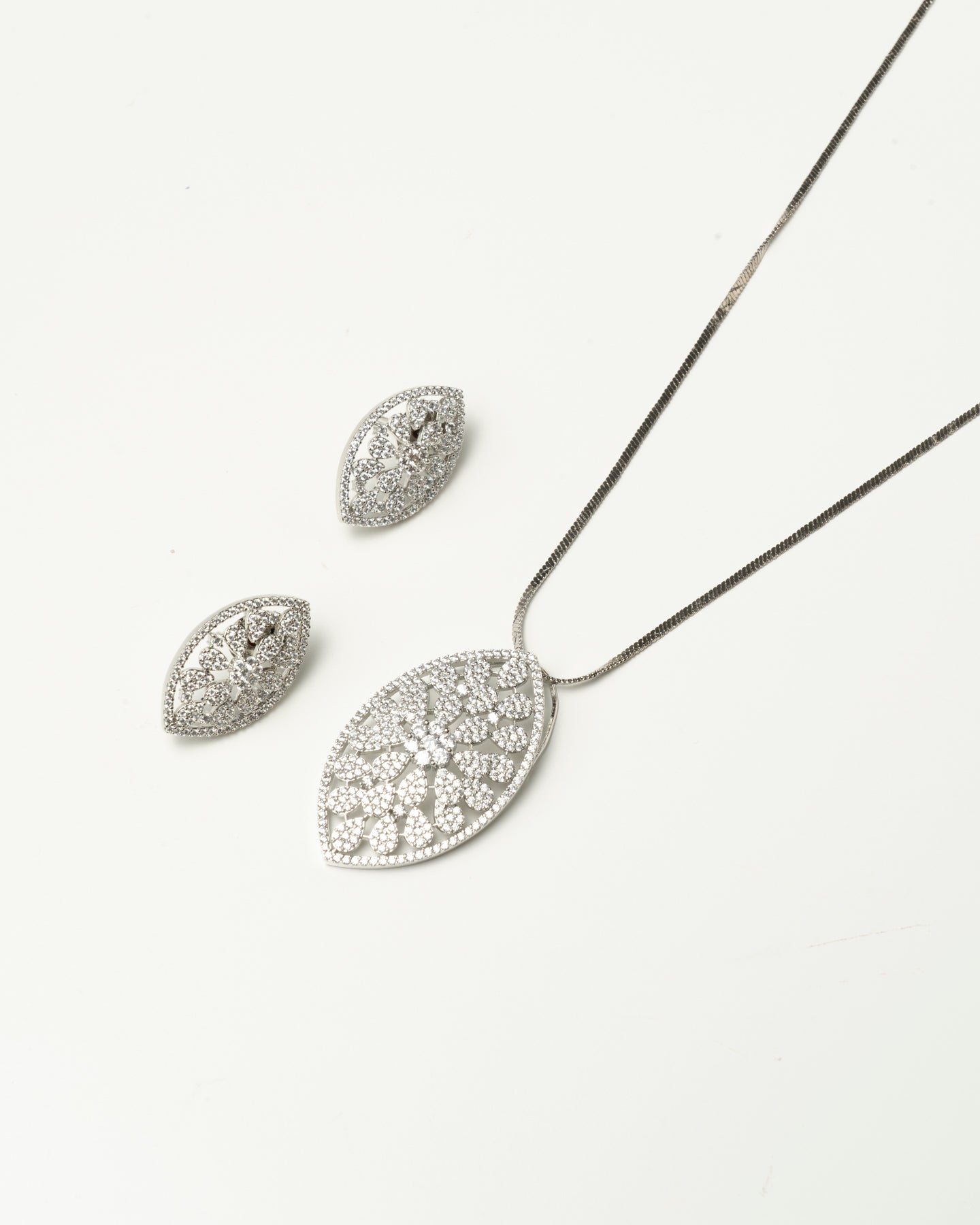 Un conjunto de colgante y pendientes con una elegante forma ovalada de circonitas que captura la luz con delicadeza. Su diseño transmite sofisticación y armonía, aportando un toque brillante que realza cualquier look con estilo y feminidad.