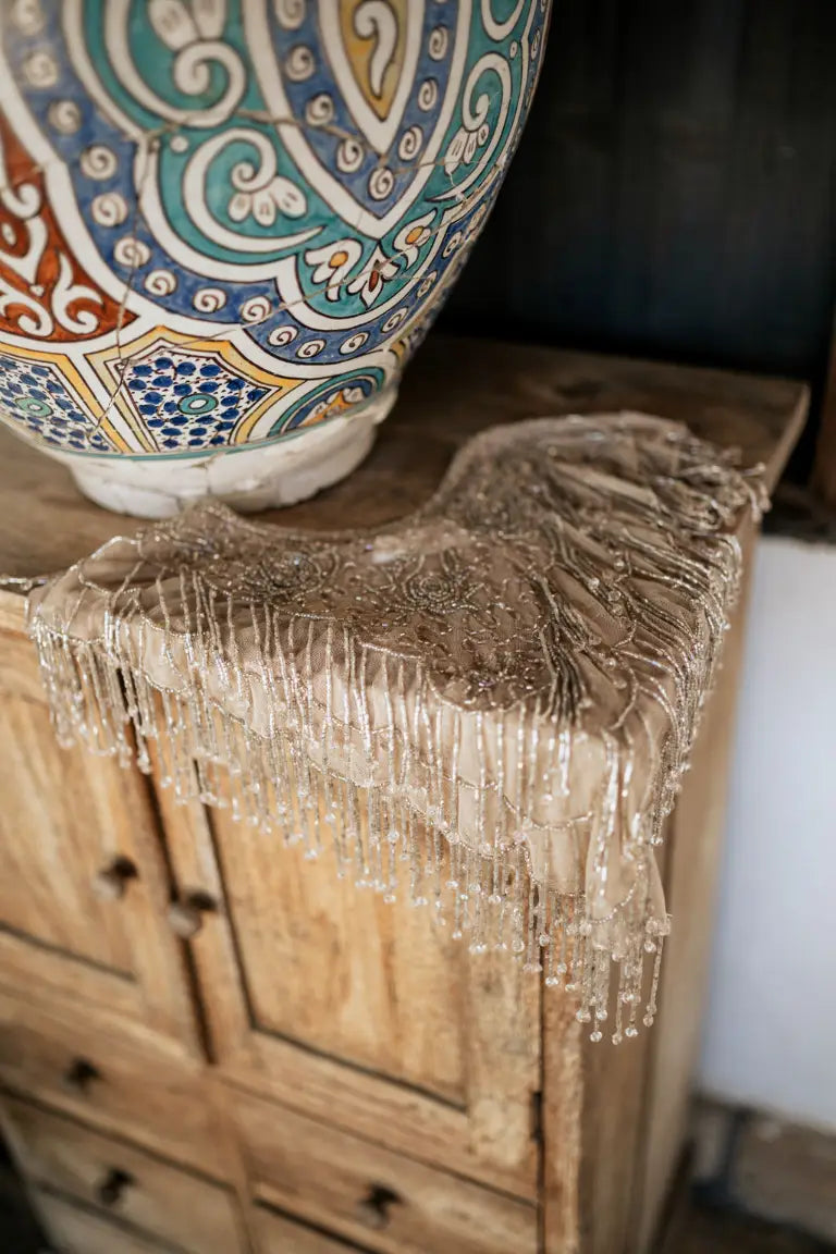 Está repleto de detalles distribuidos de forma armoniosa, creando un efecto visual complejo y llamativo que convierte esta pieza en un accesorio único y muy especial.