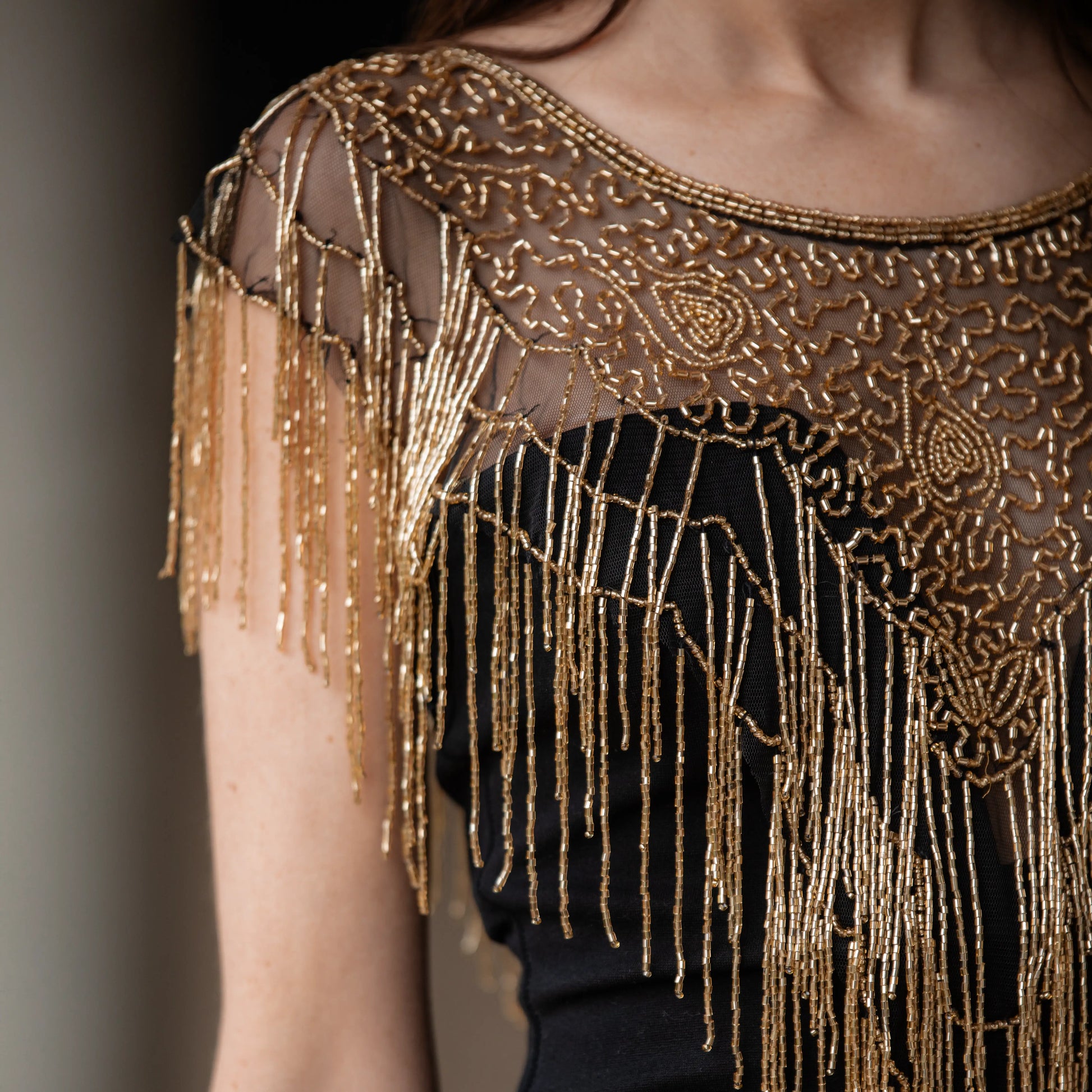 El Cuello Joya Esencia es una pieza larga con forma de pico que aporta fuerza y presencia a cualquier conjunto. Su diseño envolvente realza el escote de manera elegante y sofisticada.