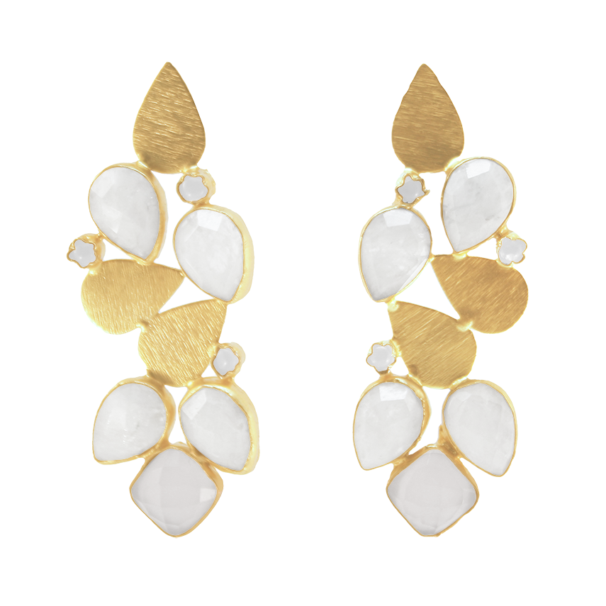 Originales y elegantes pendientes alargados que combina partes doradas en forma de gota y piedras naturales en la misma forma. Termina con una piedra cuadrada.