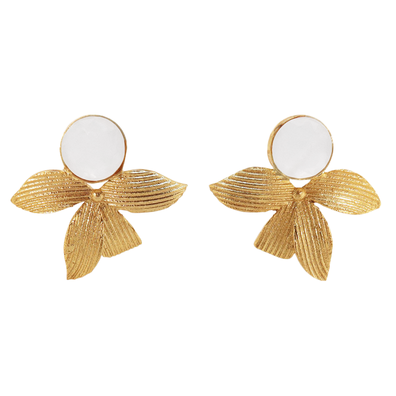Cada pendiente presenta cuatro hojas que culminan en una piedra circular en la parte superior. De tamaño medio, son ideales para todos los días, agregando un toque especial a tus looks cotidianos.