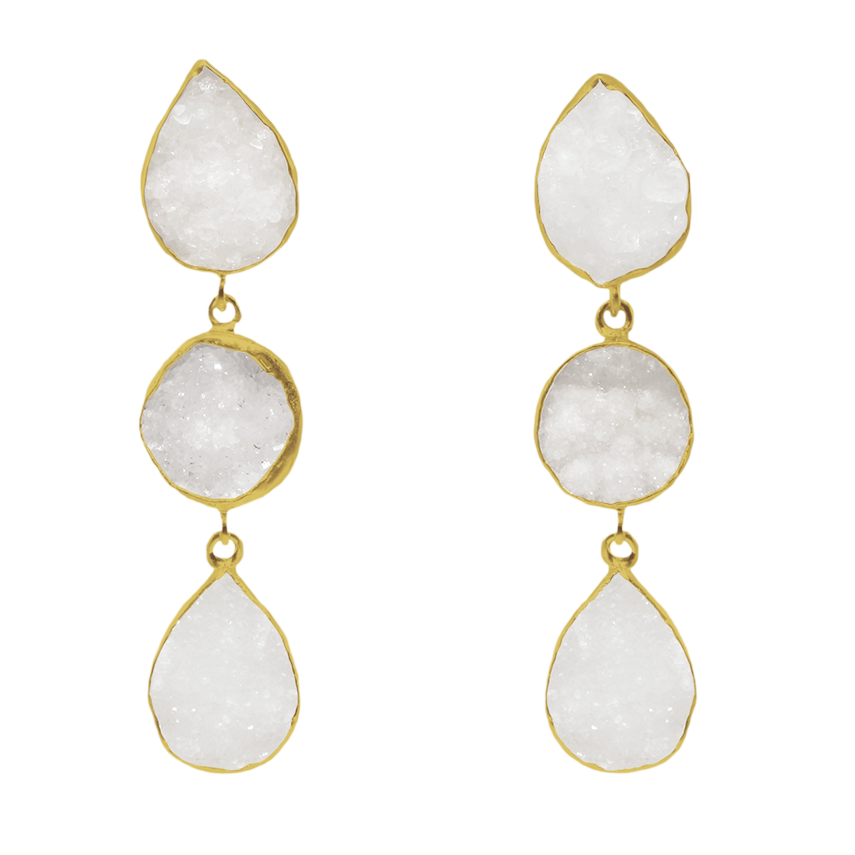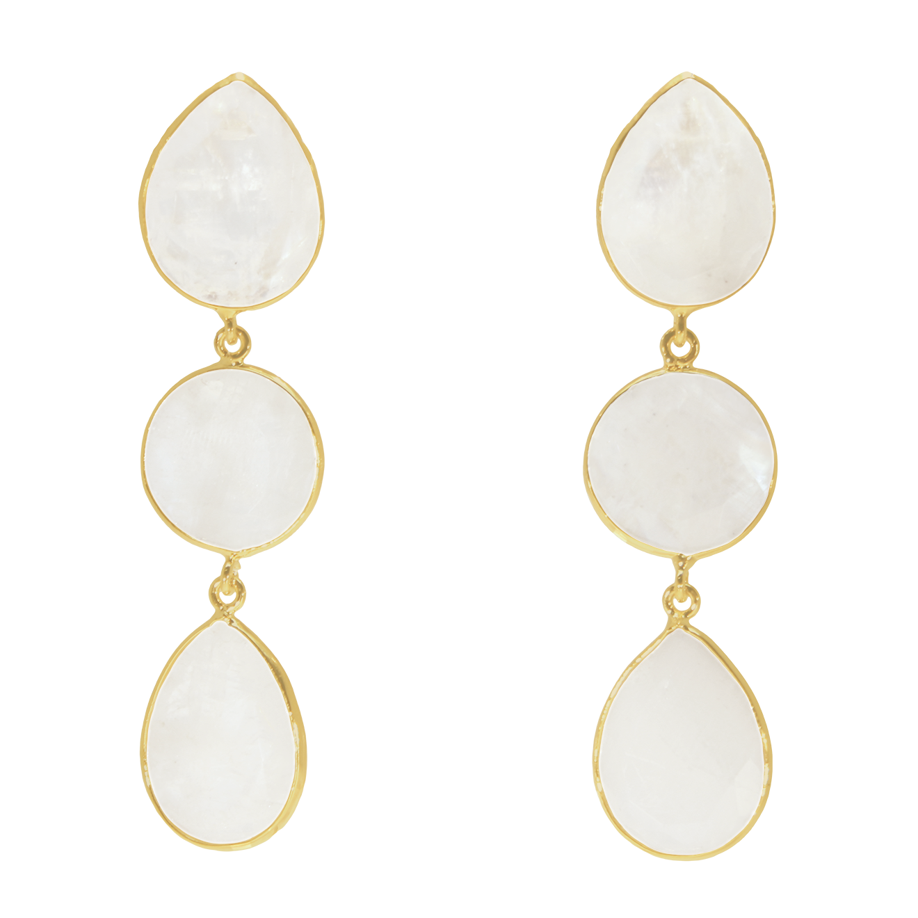 Pendientes de tres piedras pulidas naturales: una piedra gota, una piedra círculo y una piedra gota.