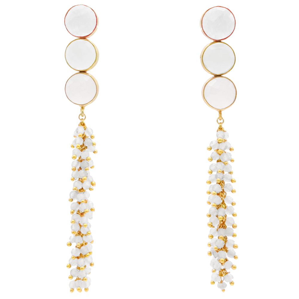 Deslumbra con estos elegantes pendientes, destacando tres piedras circulares en la parte superior de las cuales se despliega un encantador racimo de pequeñas piedritas en el mismo tono. Un diseño refinado que añade brillo y sofisticación a tu look en cualquier ocasión.