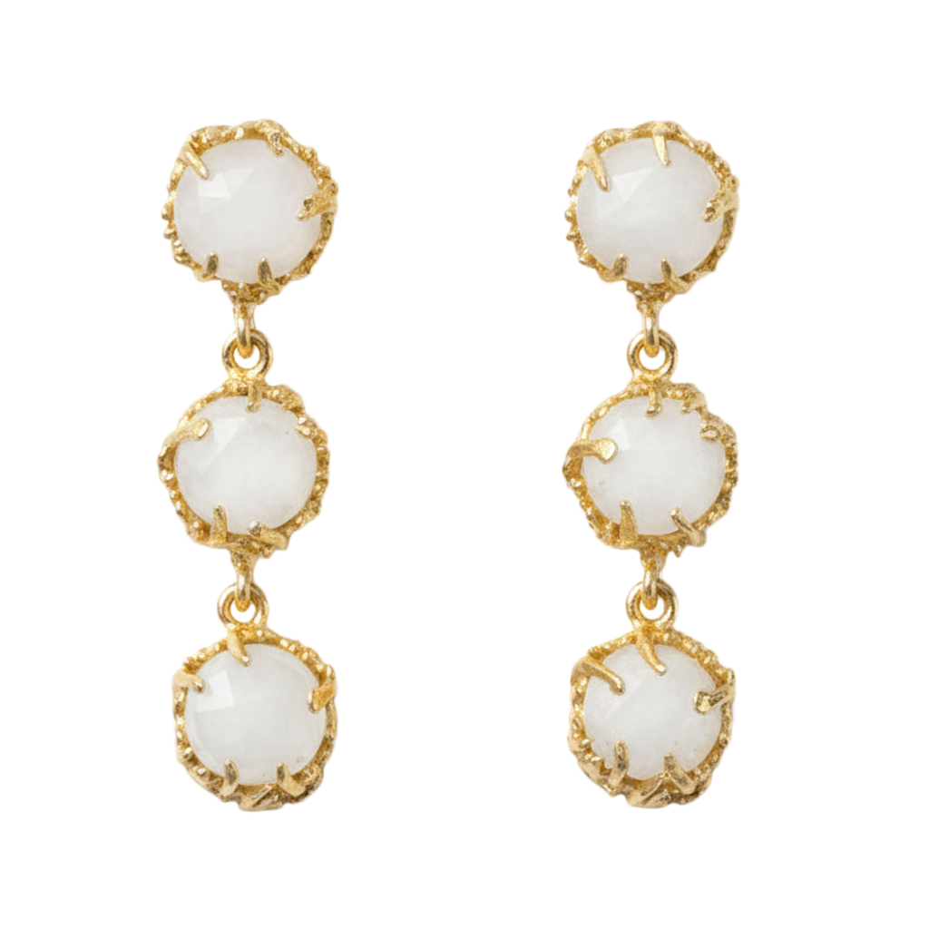 Estos pendientes están compuestos por tres piedras redondas dispuestas en cascada, una debajo de otra, creando un diseño elegante y con movimiento. La disposición vertical de las piedras aporta un toque dinámico y refinado, ideal para alargar visualmente el cuello y añadir un brillo sutil al rostro. Este diseño clásico es perfecto para complementar tanto looks formales como casuales, ofreciendo un equilibrio entre simplicidad y sofisticación. Los pendientes son una opción versátil para cualquier ocasión, aportando un toque de distinción y elegancia.