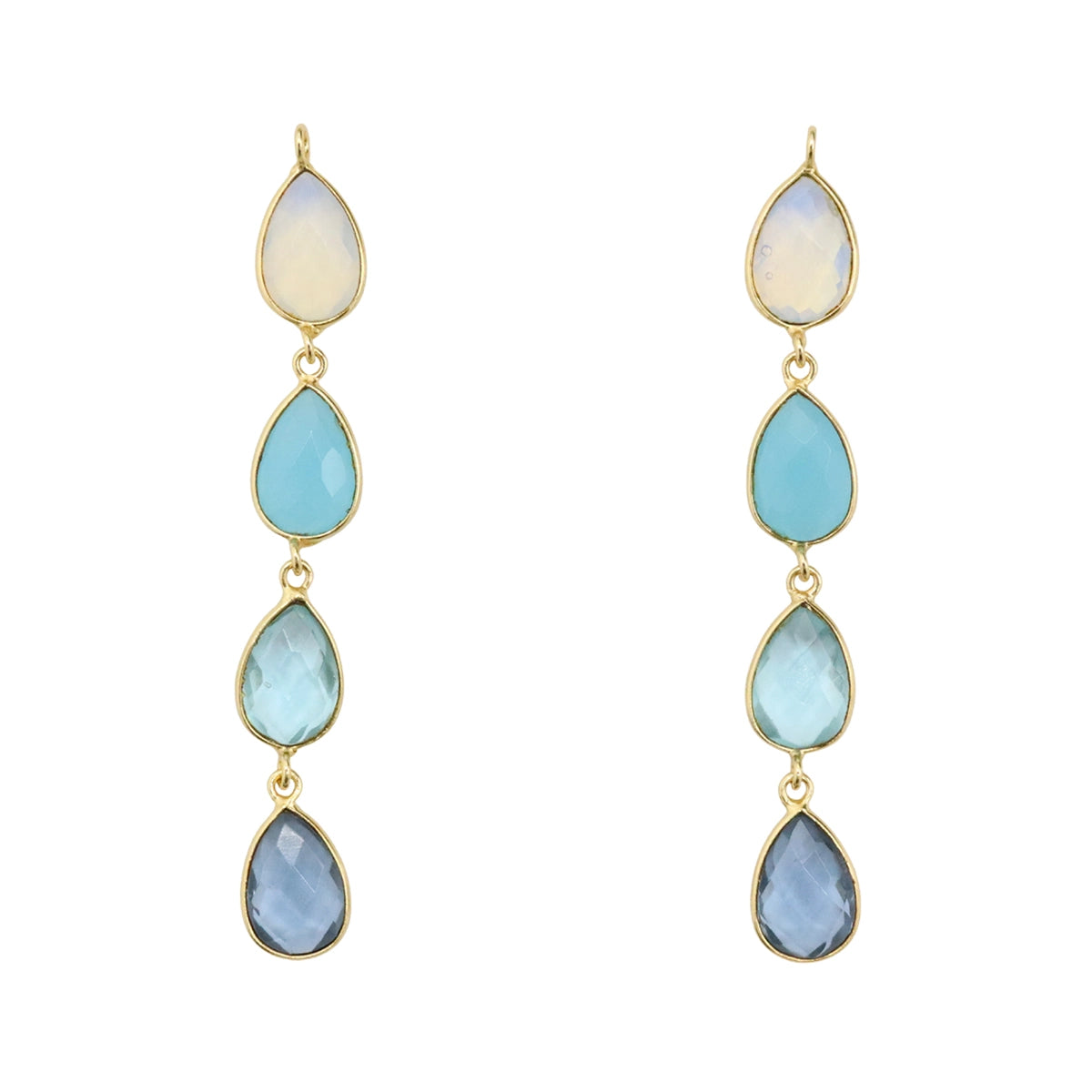 Estas delicadas piezas destacan por su composición armónica de piedras naturales en forma de lágrima, unidas por finas piezas doradas que crean un movimiento sutil y elegante. Cada piedra refleja la luz con un brillo suave, aportando frescura y vitalidad a cualquier combinación.