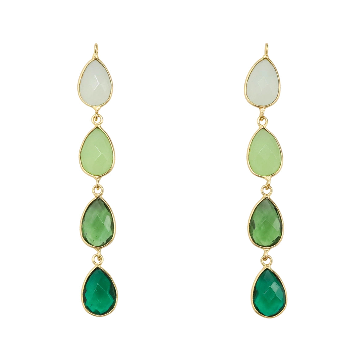 Estas delicadas piezas destacan por su composición armónica de piedras naturales en forma de lágrima, unidas por finas piezas doradas que crean un movimiento sutil y elegante. Cada piedra refleja la luz con un brillo suave, aportando frescura y vitalidad a cualquier combinación.