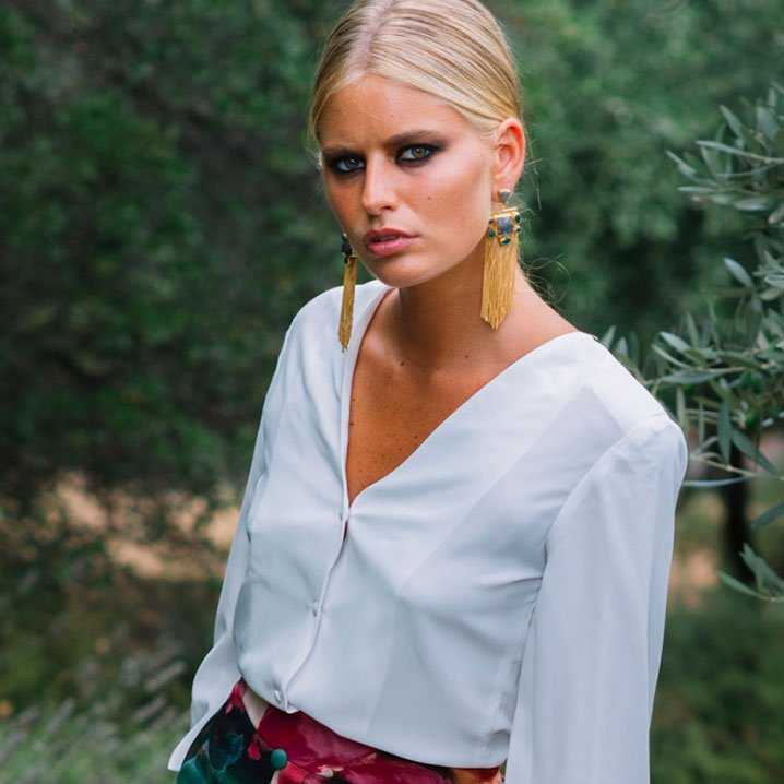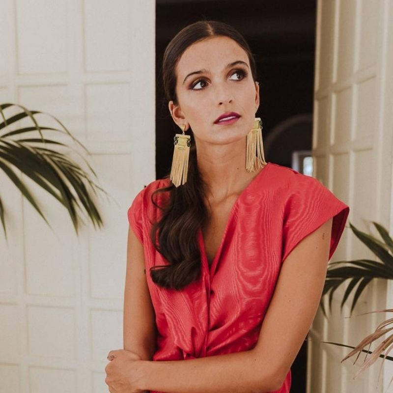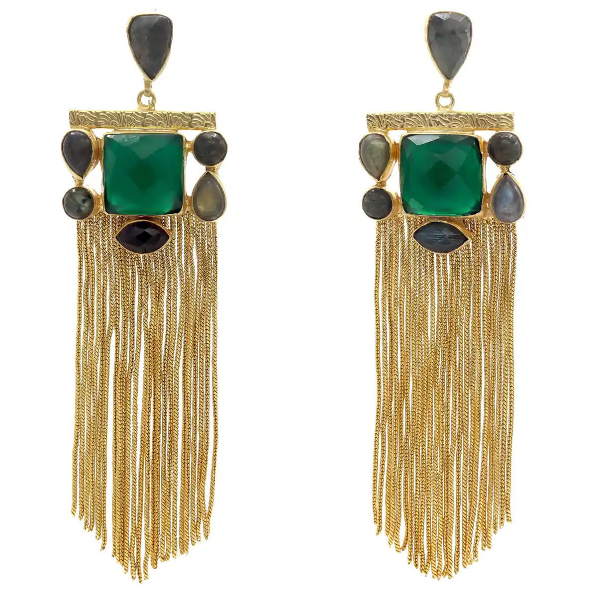 Pendientes con un diseño muy original que presenta siete piedras naturales. Una de ellas sirve como enganche, mientras que otra de tamaño más grande y cuadrada está rodeada por otras más pequeñas. Completa el estilo con elegantes flecos, creando un accesorio único que destaca por su originalidad y sofisticación.