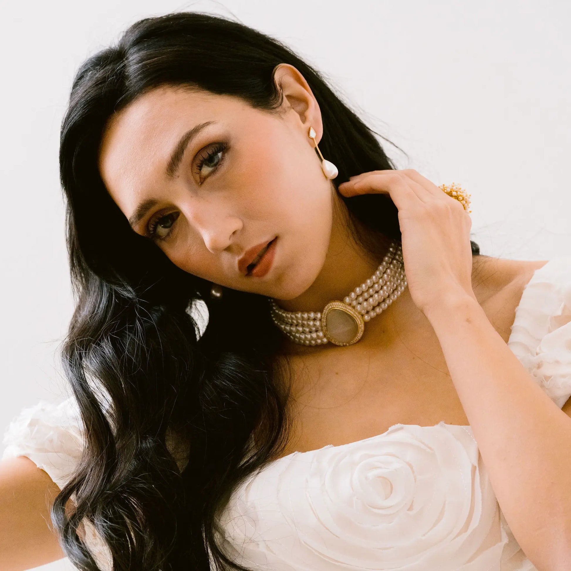 Los pendientes Amata son la definición de elegancia serena. Su diseño minimalista resalta una única perla lágrima que cuelga de una estructura dorada recta, logrando un efecto alargado y limpio. Una joya que no compite con el vestido, sino que lo acompaña con delicadeza y presencia.