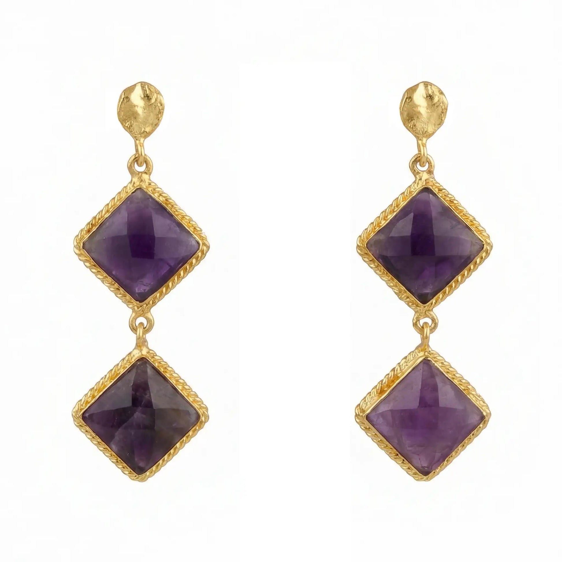 Deslumbra con estos pendientes sofisticados y elegantes. Una superficie dorada sostiene dos piedras naturales colgantes dispuestas una debajo de la otra, creando un diseño cautivador que añade un toque de lujo y belleza a tu estilo.