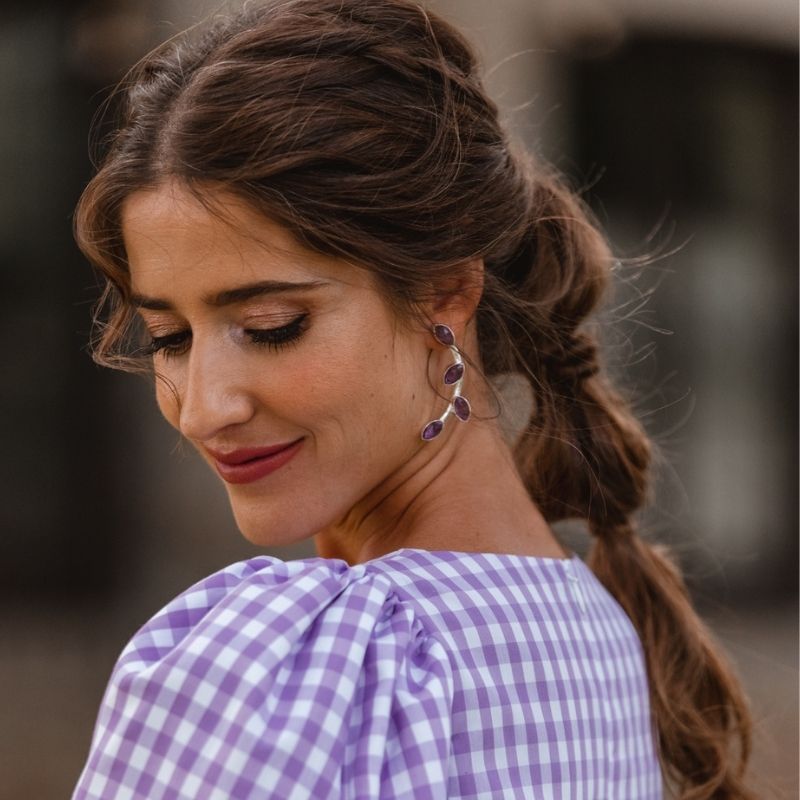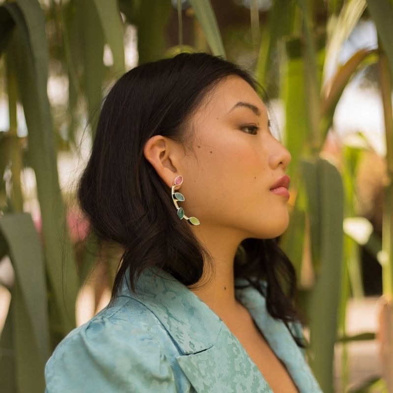 Pendientes en forma de delicada rama, compuesta por un arco dorado y pequeñas piedras de forma ovalada imitando hojas. Este diseño evoca la naturaleza con un toque de elegancia, creando un accesorio que resalta por su sutileza y originalidad.
