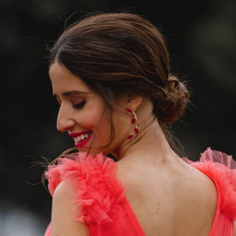 Pendientes en forma de delicada rama, compuesta por un arcoy pequeñas piedras de forma ovalada imitando hojas. Este diseño evoca la naturaleza con un toque de elegancia, creando un accesorio que resalta por su sutileza y originalidad.