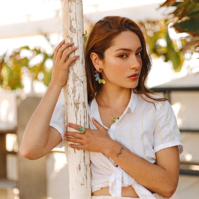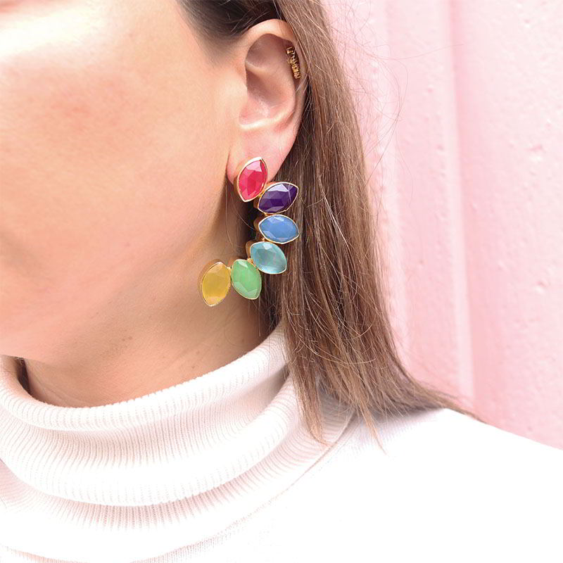 Pendientes de seis piedras en forma de marquesa unidas formando una curva. Estos pendientes alegran el rostro a la vez que lucen muy original. Con ellos arriesgas y ganas. Un imprescindible en tu joyero para salvarte en múltiples ocasiones y eventos. Unos pendientes que ya se han convertido en todo un icónico de ACUS. ¿Aún no los tienes?