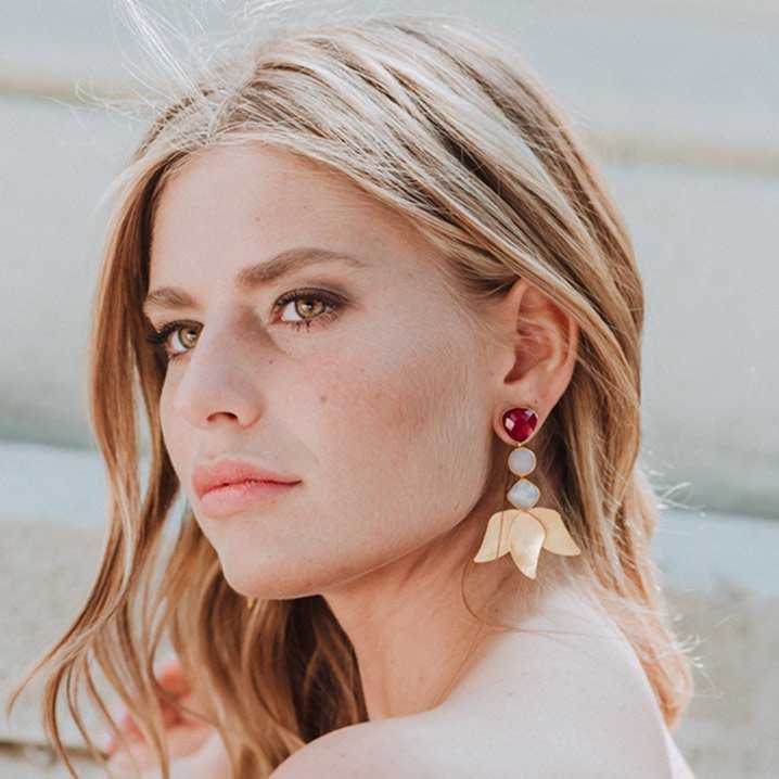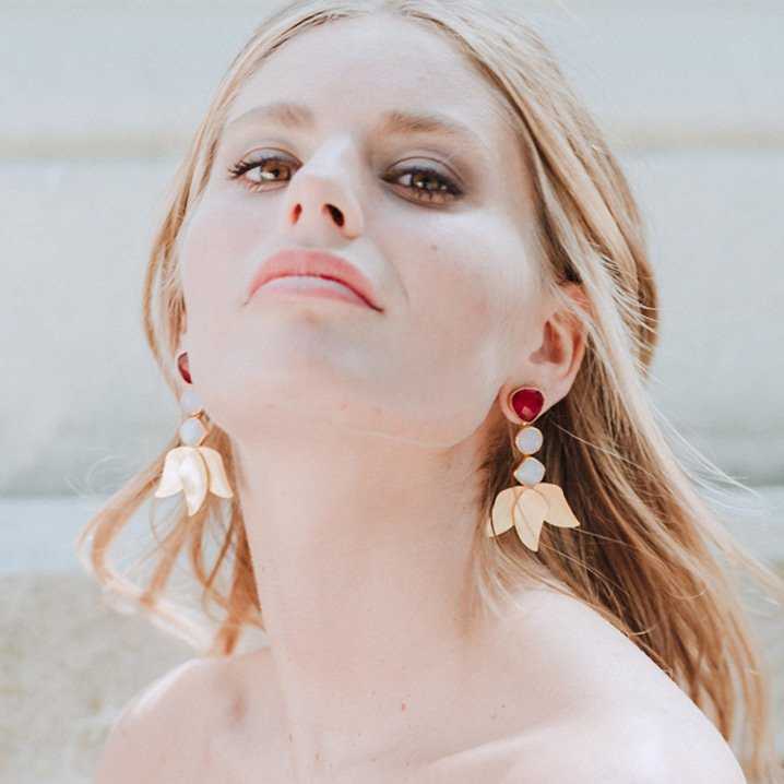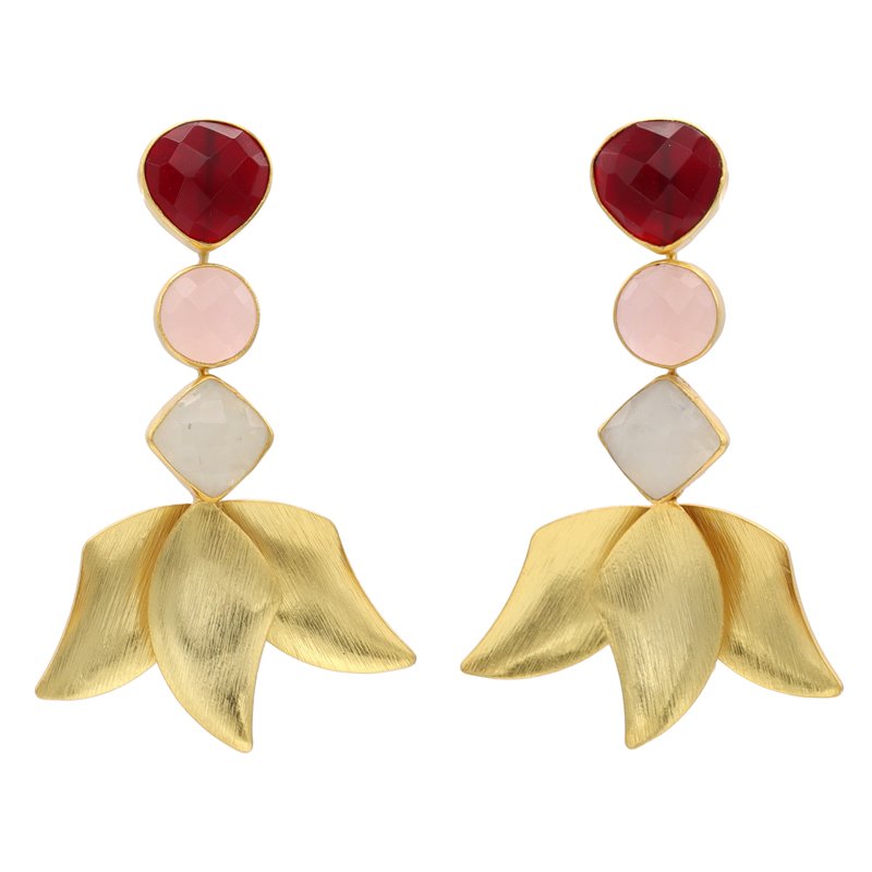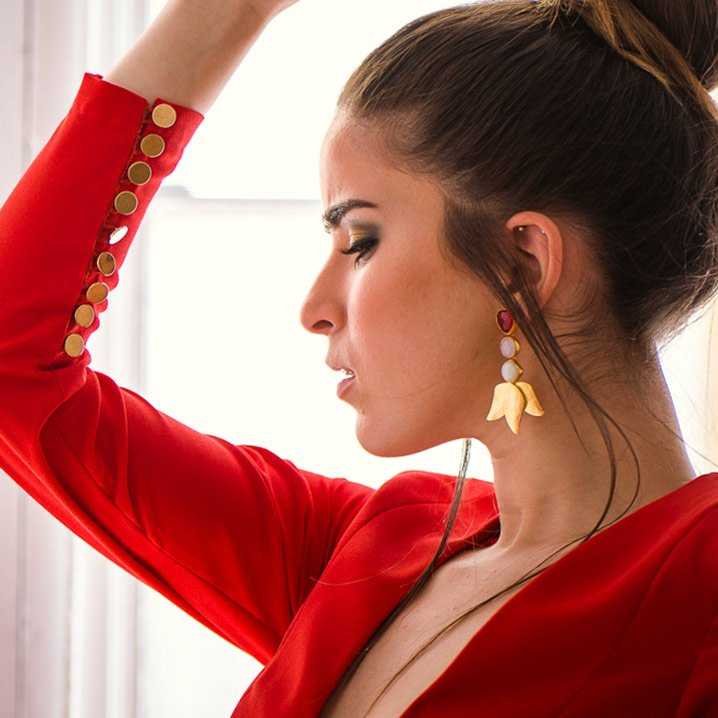 Originales y elegantes pendientes con tres piedras alineadas donde una de ellas recoge tres hojas artesanales. Favorecen por el brillo de las hojas y dan un punto diferente y distinguido al estilismo. Con ellos aciertas seguro.