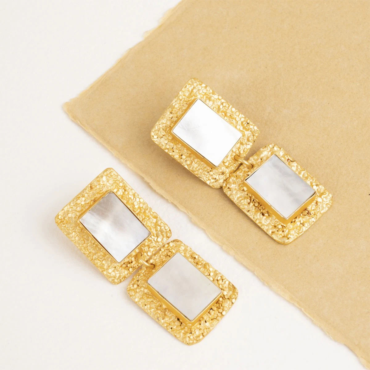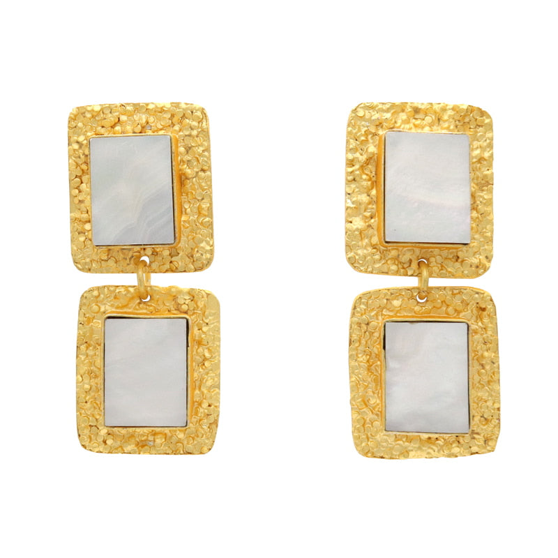 Pendientes formados por dos cuadrados con piedras sobre una placa texturizada.