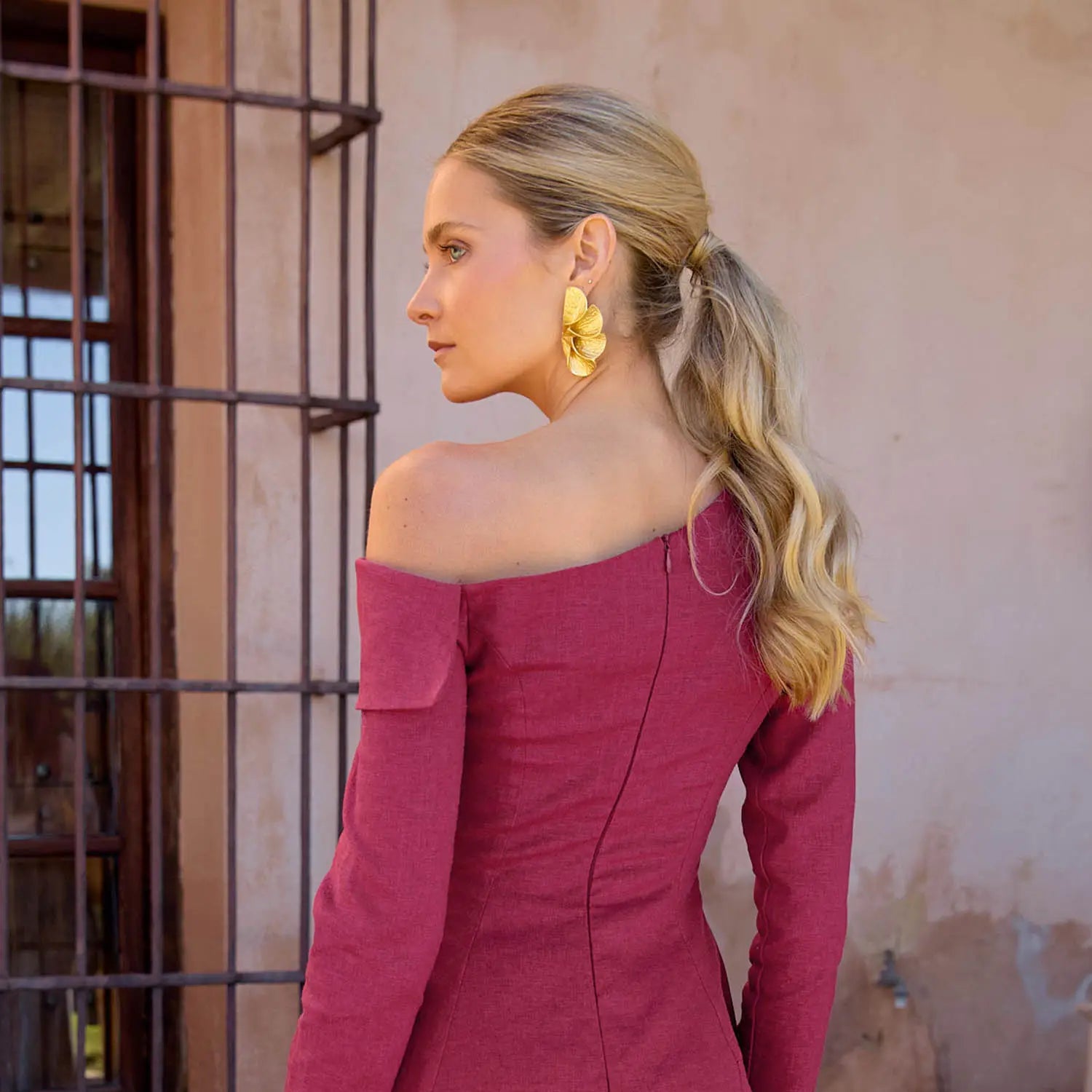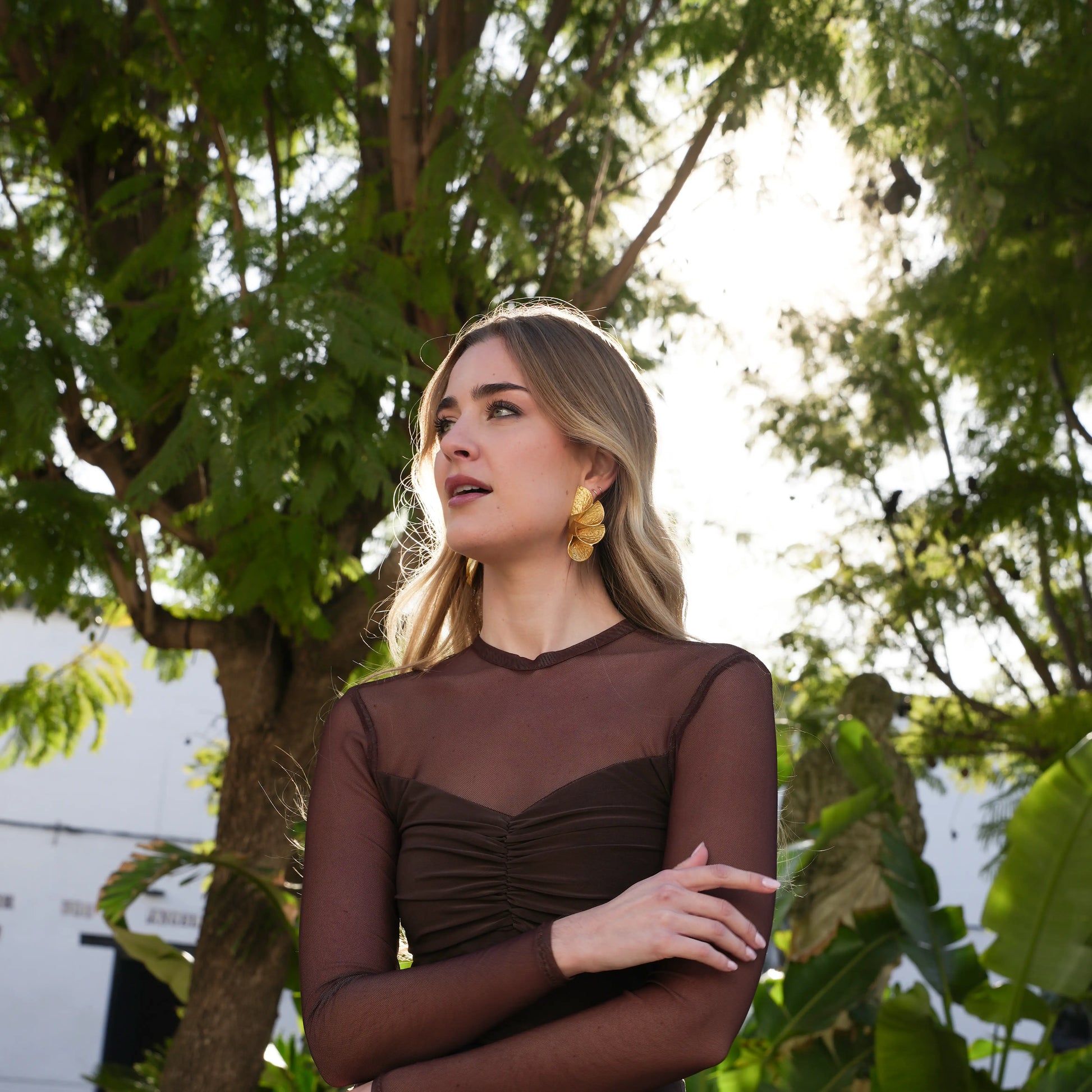 These four folded leaf earrings are a true visual luxury. Each leaf, with its cartouche shape, overlaps precisely, forming a semicircle that elegantly and modernly embraces the ear. The geometry and folds capture light in a unique way, creating a sophisticated shimmer that effortlessly commands attention. A sculptural and refined design, created for those seeking a striking, elegant, and utterly irresistible accessory.