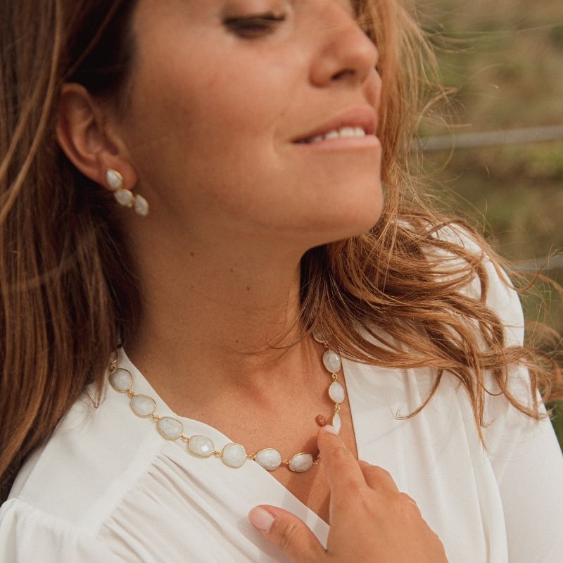 Este diseño minimalista presenta tres piedras dispuestas hacia abajo en forma de gota, añadiendo un toque elegante y sutil a cualquier conjunto, ya sea para el día a día o para ocasiones más especiales.