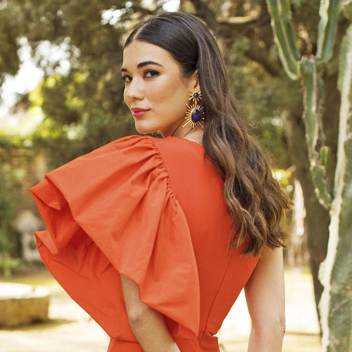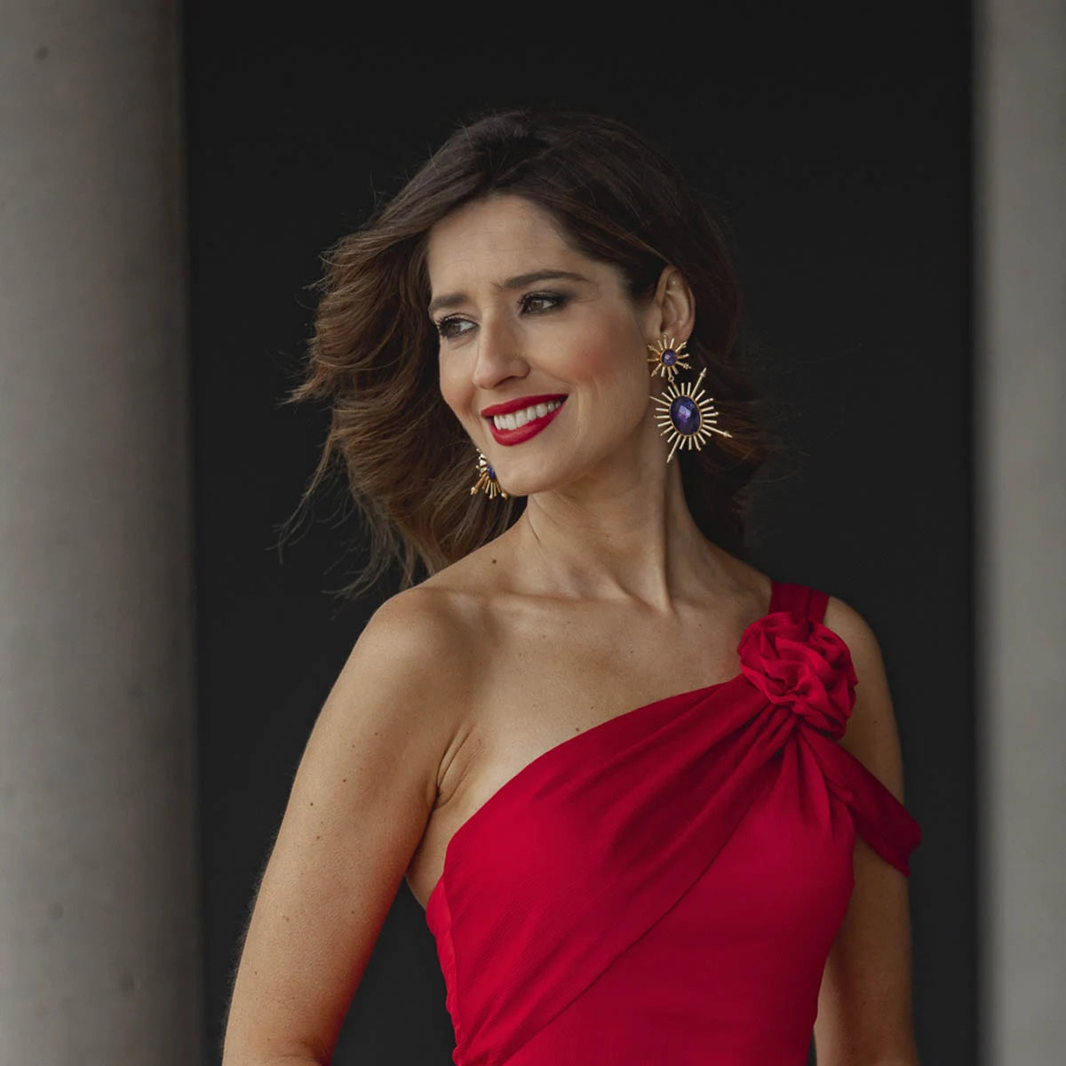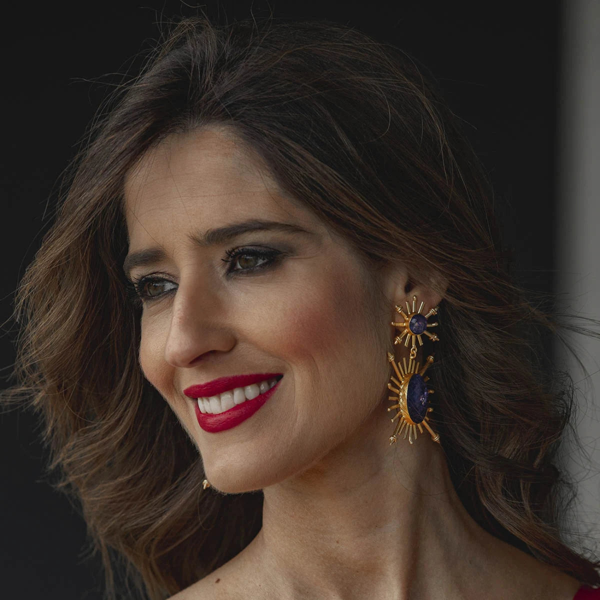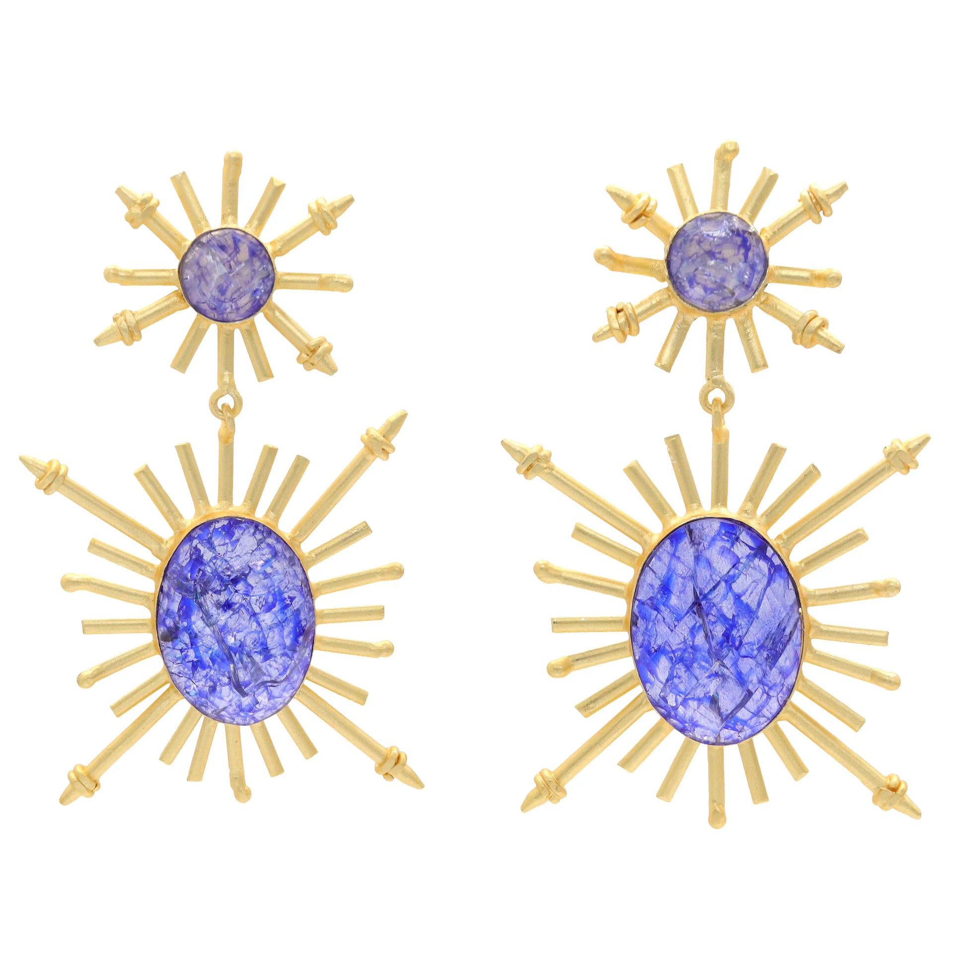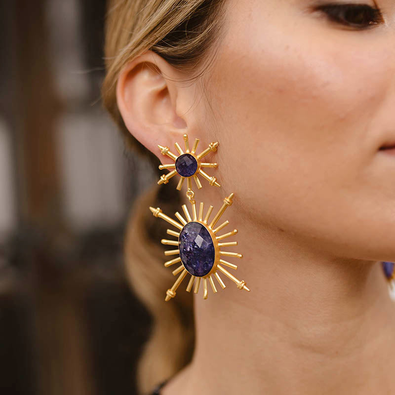 Este modelo impresionante presenta una piedra redonda central, de la cual emergen diversos rayos, y una forma ovalada inferior con líneas que se extienden en todas las direcciones, culminando en cuatro puntas. El diseño evoca la imagen de dos soles, creando un impacto visual único. Este modelo grande y vistoso no dejará indiferente a nadie, siendo la elección perfecta para quienes buscan un accesorio llamativo y lleno de energía. Añade un toque de elegancia y originalidad a tus looks con estos pendientes que destacarán tu estilo con su presencia imponente.