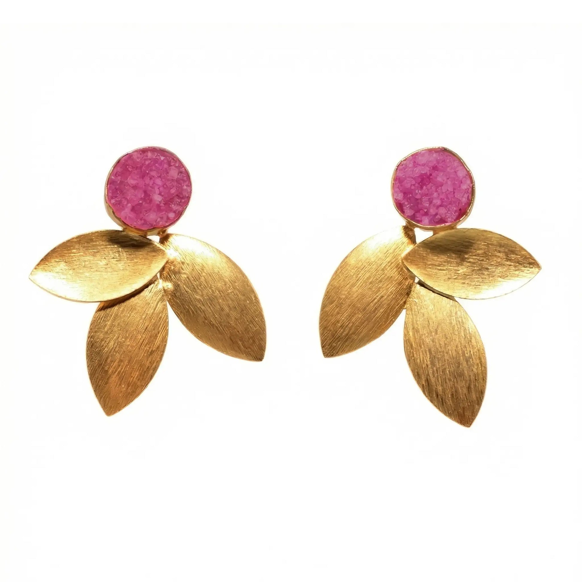 Originales pendientes formados por tres hojas artesanales con una piedra circular. Este diseño único destaca por su elegancia y singularidad. Además de ser cómodos de llevar, también son muy versátiles y fáciles de combinar.