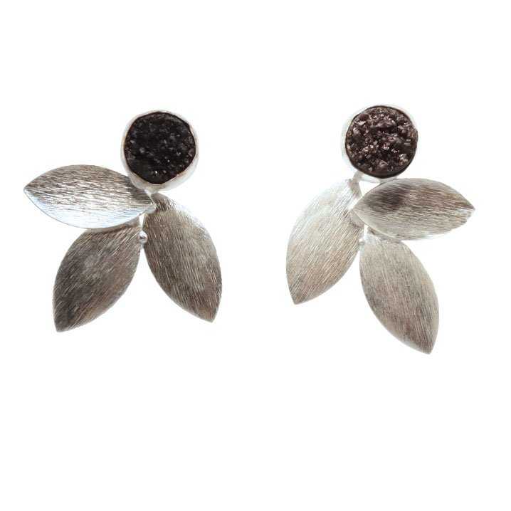 Originales pendientes formados por tres hojas artesanales con una piedra circular. Este diseño único destaca por su elegancia y singularidad. Además de ser cómodos de llevar, también son muy versátiles y fáciles de combinar.