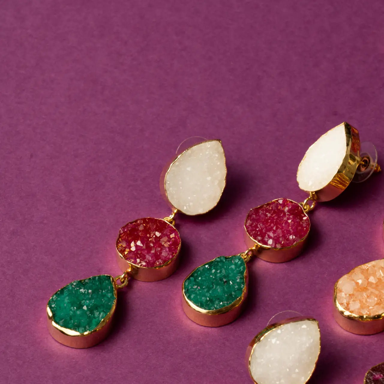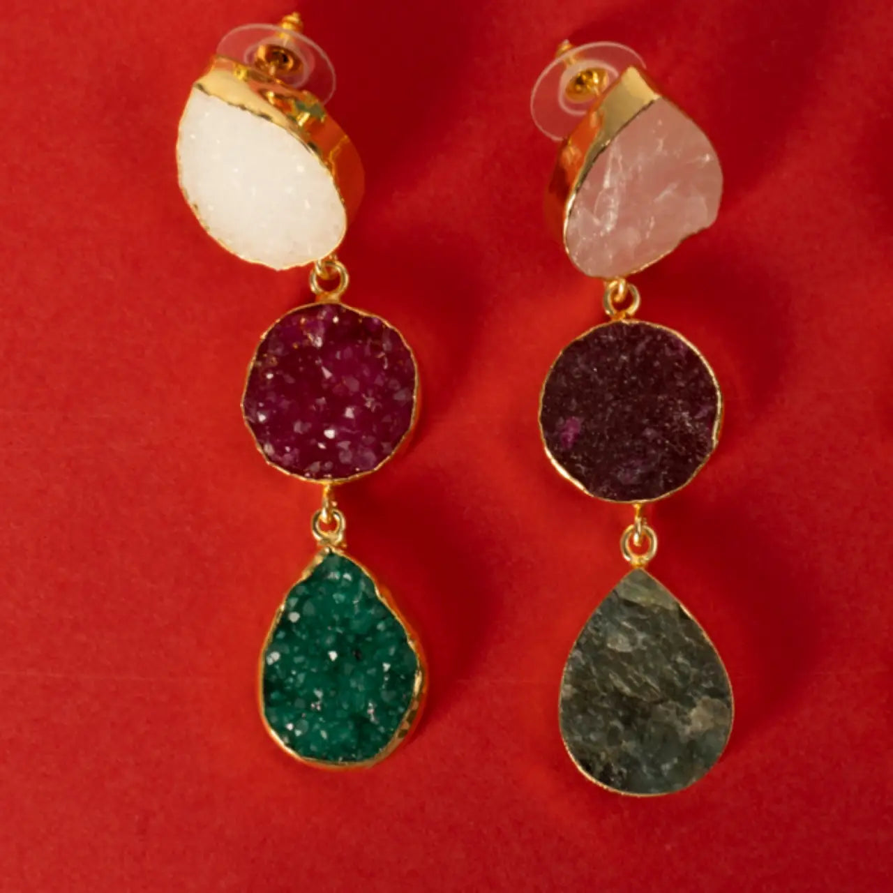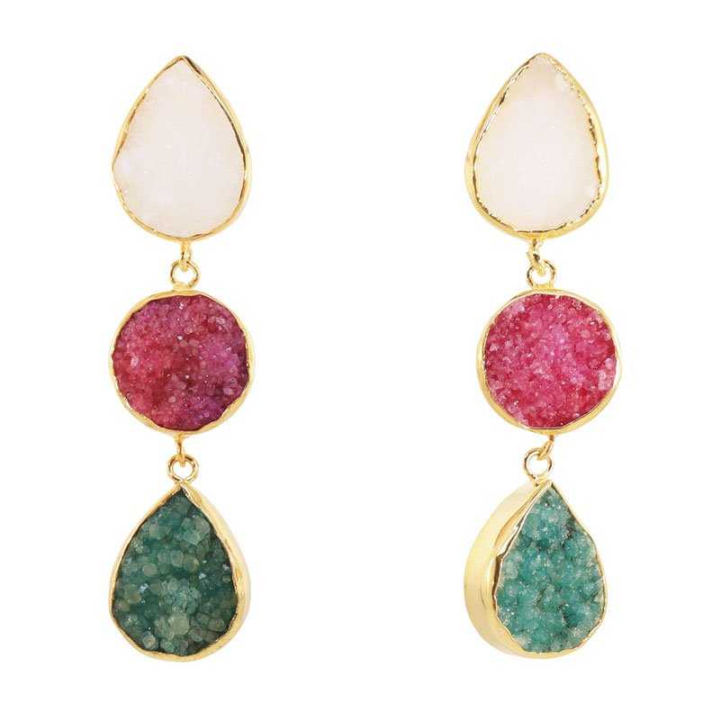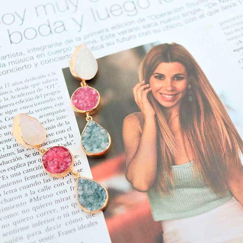 Pendientes con tres piedras dispuestas en vertical: una en forma de gota, otra circular y otra en forma de gota. Estos pendientes no solo iluminan tu rostro, sino que también deslumbran con su elegancia y originalidad. Un accesorio imprescindible en tu armario para destacar en ocasiones y eventos. Además, la piedra directa en la oreja es ideal para cubrir rajaduras.