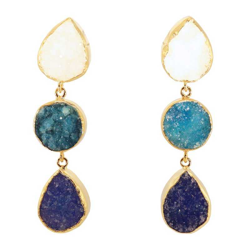Pendientes con tres piedras dispuestas en vertical: una en forma de gota, otra circular y otra en forma de gota. Estos pendientes no solo iluminan tu rostro, sino que también deslumbran con su elegancia y originalidad. Un accesorio imprescindible en tu armario para destacar en ocasiones y eventos. Además, la piedra directa en la oreja es ideal para cubrir rajaduras.