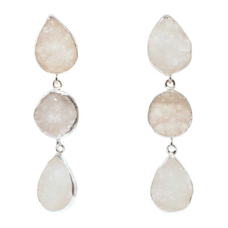 Pendientes con tres piedras dispuestas en vertical: una en forma de gota, otra circular y otra en forma de gota. Estos pendientes no solo iluminan tu rostro, sino que también deslumbran con su elegancia y originalidad. Un accesorio imprescindible en tu armario para destacar en ocasiones y eventos. Además, la piedra directa en la oreja es ideal para cubrir rajaduras.