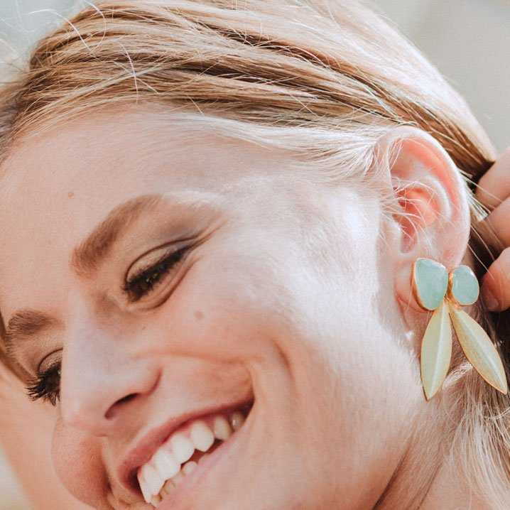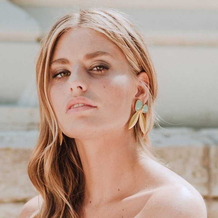 Pendientes originales y elegantes con dos piedras de diferentes tamaños. Entre ellas, dos hojas alargadas separadas crean un efecto único. Este diseño innovador fusiona la armonía de la naturaleza con la sofisticación, añadiendo un toque distintivo a tu estilo.