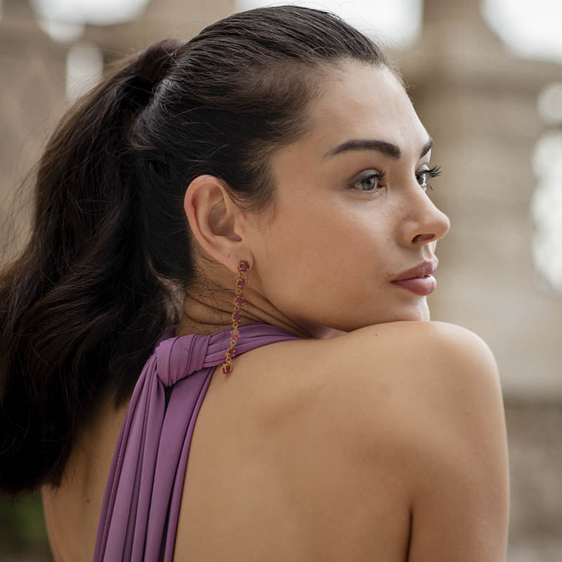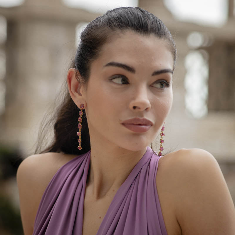 Los pendientes están compuestos por siete piedras de forma irregular, lo que les confiere un aspecto único y original. Este diseño atemporal agrega luz y movimiento a tus conjuntos, siendo una opción ideal para lucir como invitada en diversos eventos. Su llamativo estilo seguramente llamará la atención y no pasará desapercibido.