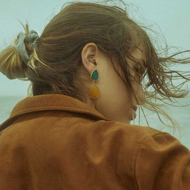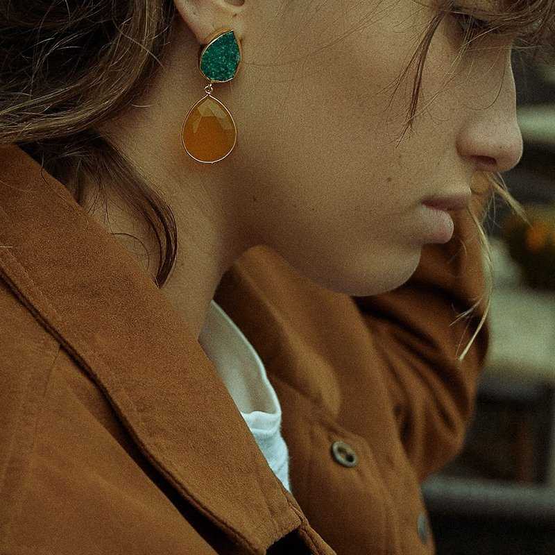 Pendientes artesanales que fusionan la destreza manual con la belleza natural. Dos piedras en forma de gota se juntan, creando una obra única que refleja la artesanía excepcional y añade un toque de encanto a tu estilo.