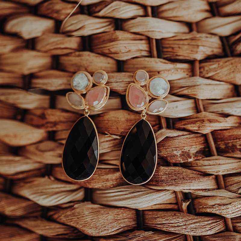 Expresa tu estilo único con estos pendientes artesanales y de diseño. Cuatro piedras en la parte superior crean una composición vibrante, mientras que una piedra grande debajo añade un toque de elegancia audaz.