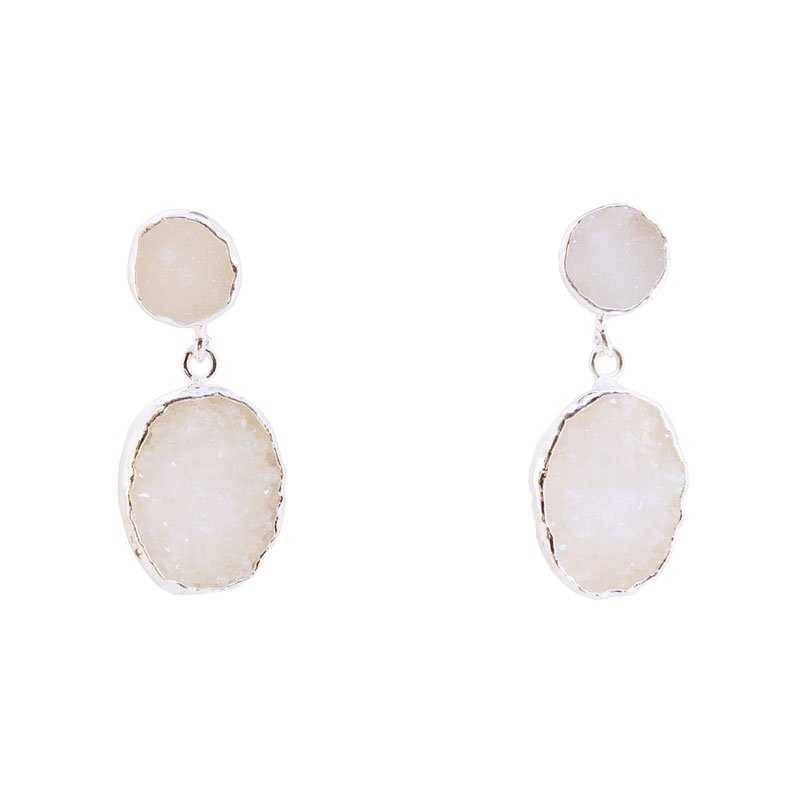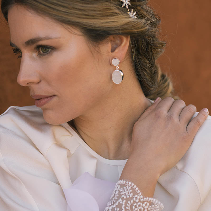 Realizados con piedras, la superior en forma circular y la inferior ovalada. Clásicos y atemporales, estos pendientes añaden un toque de elegancia y distinción a tu estilo, destacando con sutileza en cualquier ocasión.