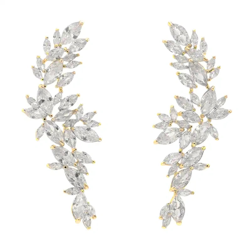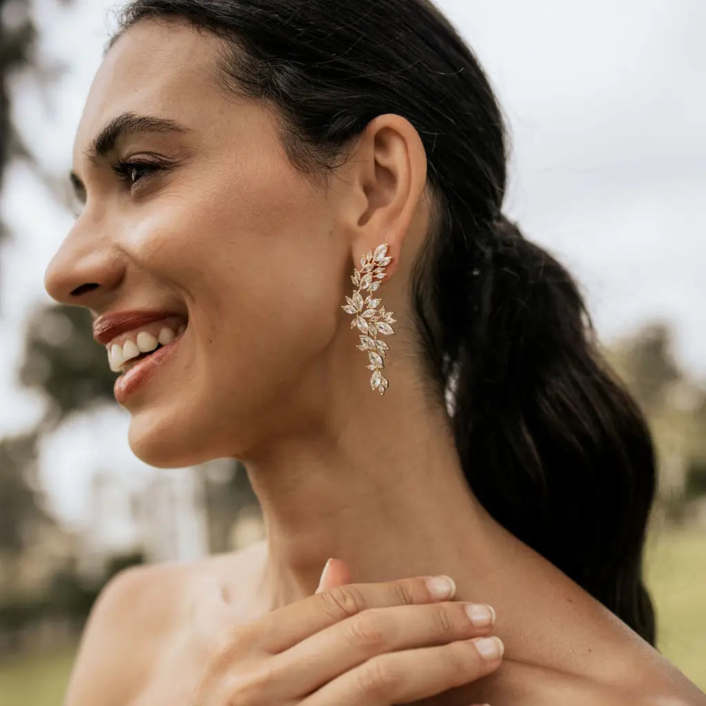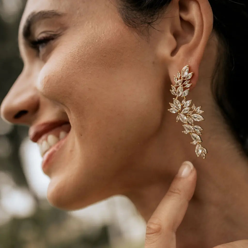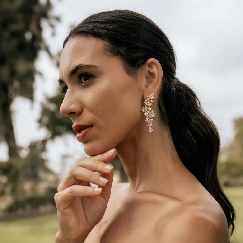 ¿Te casas y estás buscando los pendientes para tu boda? Sigue leyendo porque puede que estemos ante tus próximos pendientes de novia. Que te acompañarán ese día y después en un montón de ocasiones más. Pendientes Stunt – Un jardín de brillo en tu oído Tipo de pendiente: Ear crawler (recorre el lóbulo) Estilo: Romántico, natural, sofisticado Perfectos para: Novias con vestidos de inspiración botánica o con bordados florales Escote cuadrado, palabra de honor o cuello halter Rostros alargados o triangulares Peinados sueltos ondulados o semirrecogidos con volumen Los Pendientes Stunt dibujan una enredadera de luz sobre el lóbulo. Con forma de pequeñas hojas y cristales, aportan una frescura mágica sin dejar de ser elegantes. Para novias que buscan joyas de novia con personalidad y un aire silvestre. ✨ Consejo de estilo: Ideales para bodas al aire libre, en el campo o en jardines. Añaden un toque etéreo que eleva cualquier look nupcial.