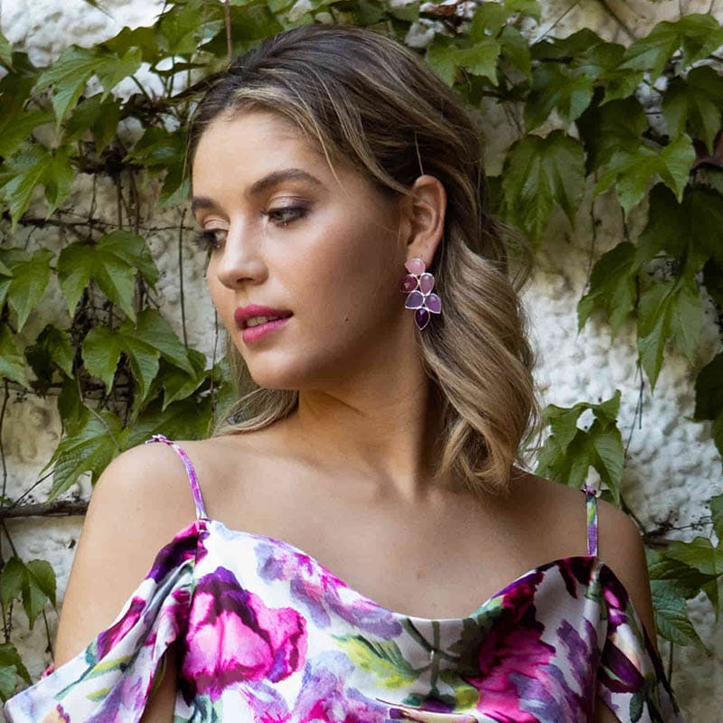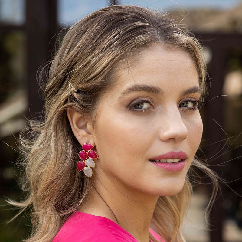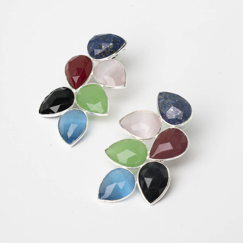 Seis piedras naturales en forma de gota, unidas entre sí en diversas orientaciones, forman estos pendientes originales y vibrantes. Además de alegrar tu rostro, este diseño único te permite arriesgar con estilo. ¡Gana en distinción y autenticidad llevando contigo estos pendientes que destacan por su originalidad y frescura!