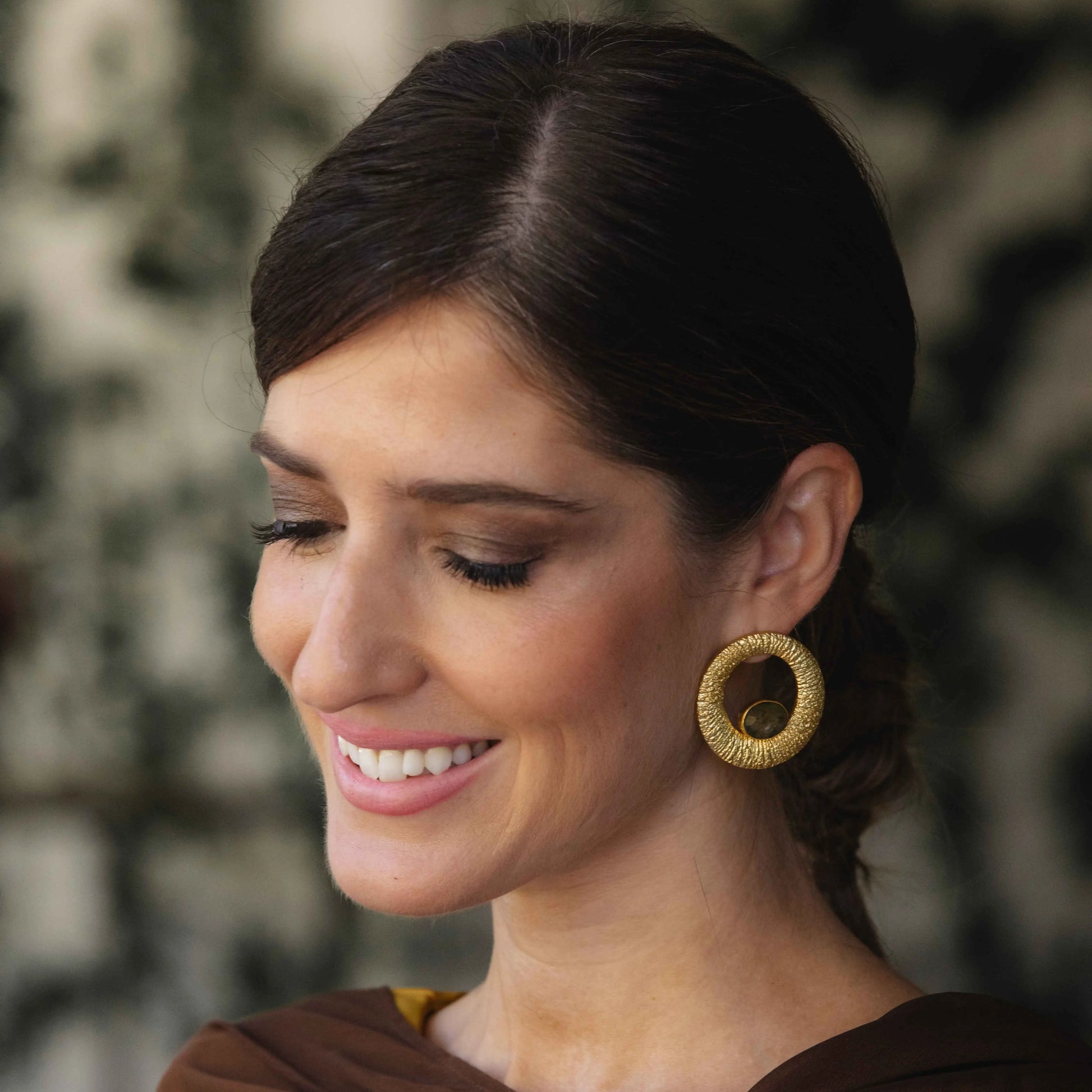 Una circunferencia labrada con destreza abraza una pequeña piedra ovalada en su parte inferior, creando un diseño cautivador. Estos pendientes son la elección perfecta para dar vida a tus looks diarios o agregar un toque de luz y color a tus conjuntos de invitada. Versátiles y elegantes, serán tus aliados en innumerables ocasiones.